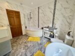 Stylish bathroom having a three piece suite in white consisting of a corner bath with mixer tap, electric shower over and glass screen, pedestal wash basin with mixer tap and twin flush low level WC. There is full height tiling to the walls, tiling underfoot, a wall mounted radiator, inset ceiling spotlights, coving to the ceiling and extractor fan. Natural light is brought in via the double glazed window with obscure glass and an internal door leads to the hallway.