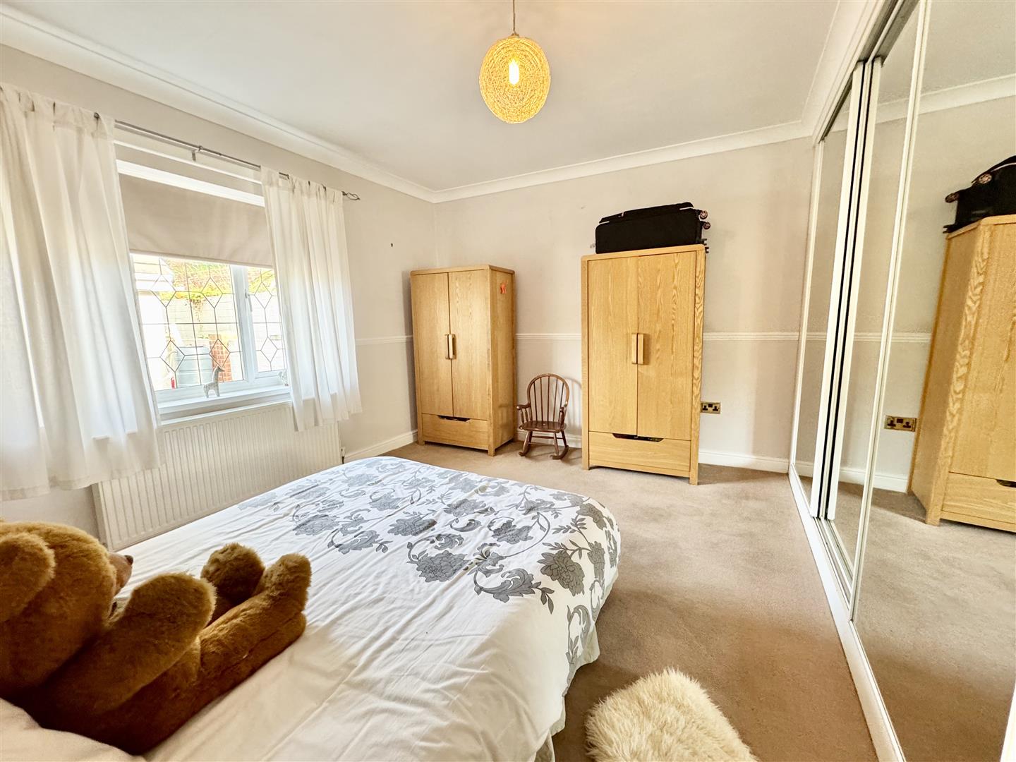 Second double bedroom, again with a fantastic range of fitted wardrobes including three triple wardrobes with plenty of space remaining for freestanding furniture. There is a pleasing amount of natural light drawn from the double glazed window, there is carpet flooring, a wall mounted radiator, pendant lighting, dado rail and coving to the ceiling.