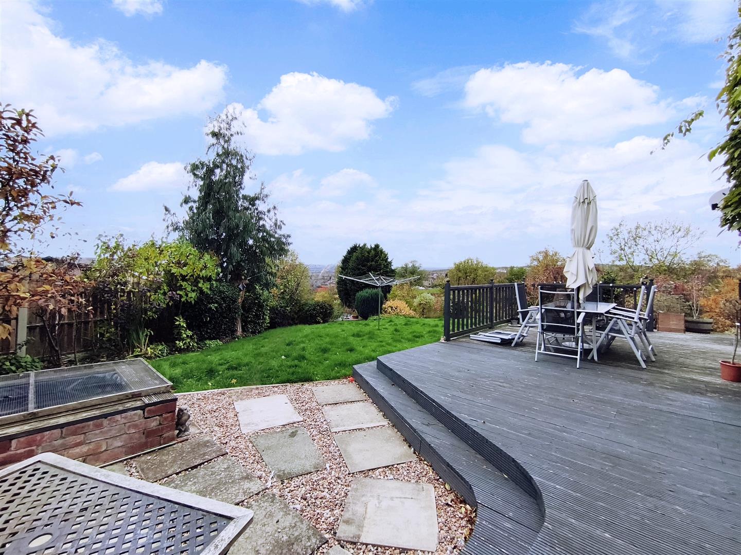 The property stands on a hugely impressive expansive plot with extensive lawned gardens to two sides. There is a patio area, a good size raised deck which enjoys far reaching views over the surrounding area and a fish pond. The gardens have high hedges and trees around the perimeter which provide a good degree of privacy whilst still allowing those uninterrupted views.