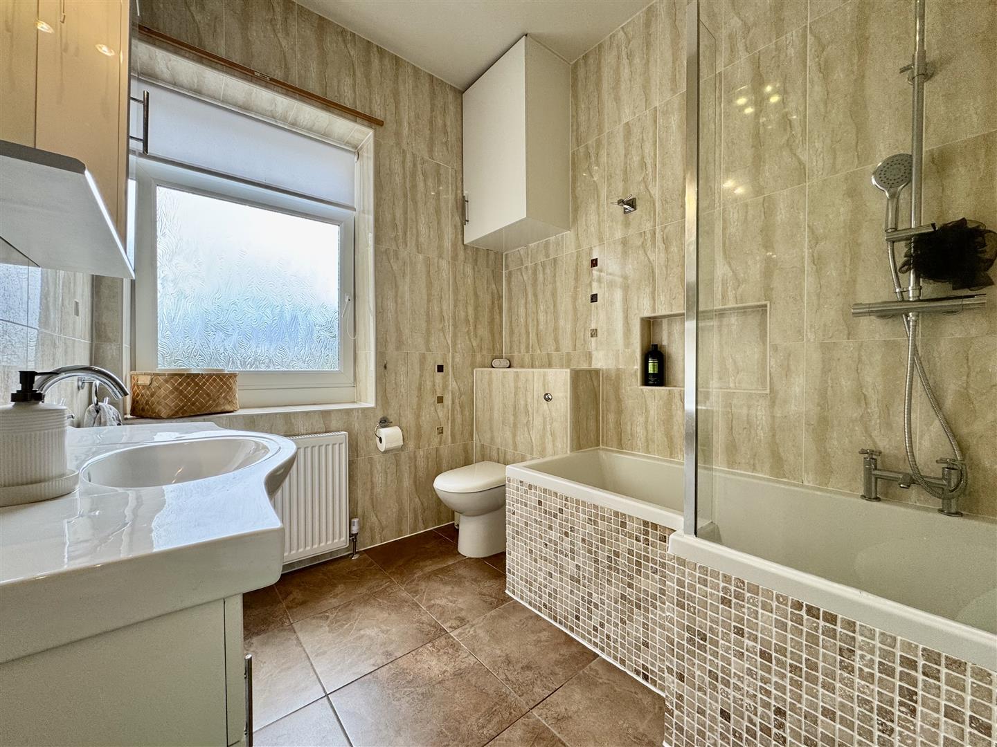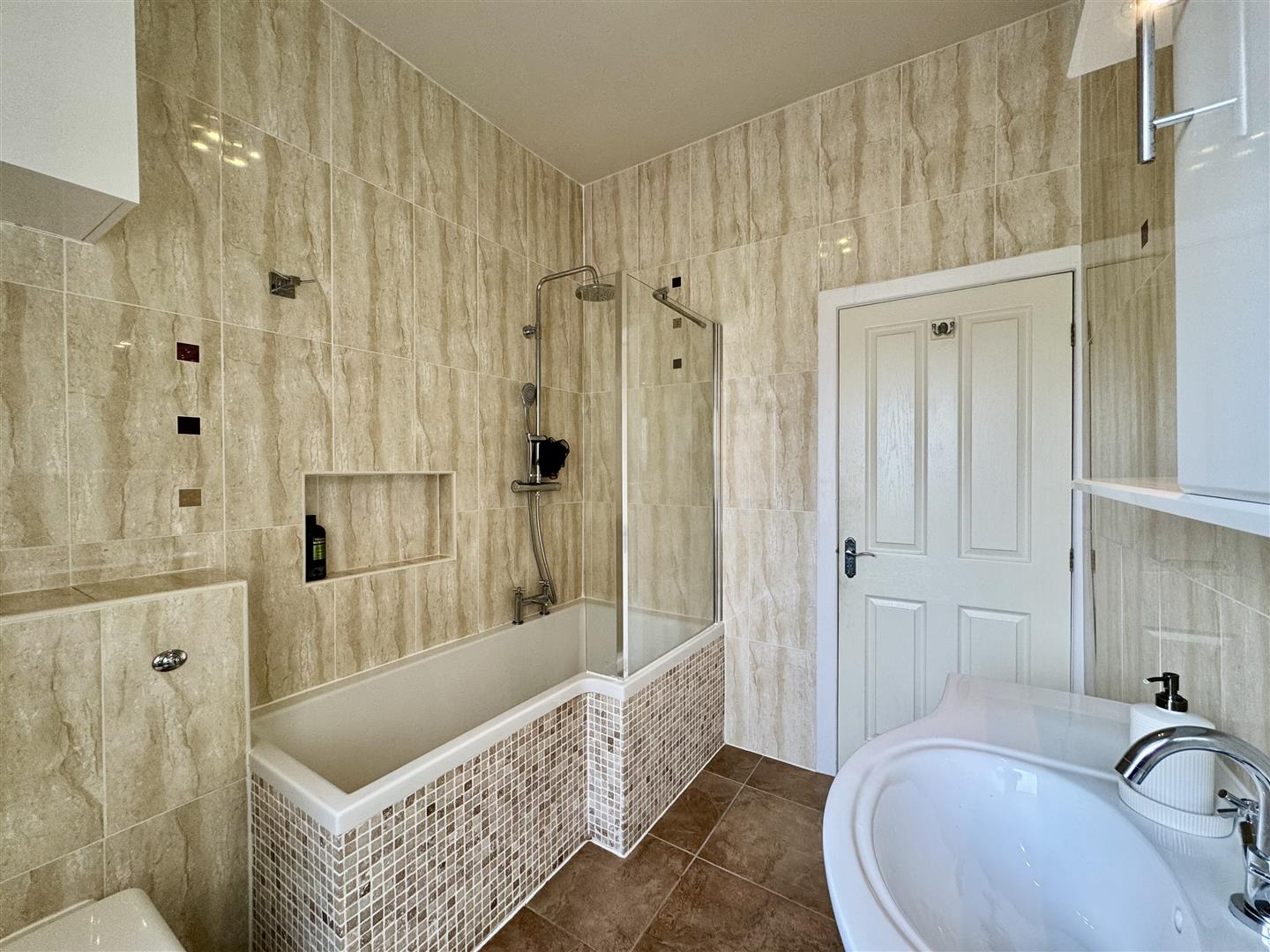 This attractive bathroom comprises of a white suite including a bath with a waterfall shower over and glass screen, a large vanity hand basin with mixer tap and a low flush W.C. The room is fully tiled, has a chrome towel radiator and complimentary tile flooring underfoot. There is an obscure glazed window and a door leads to the landing.