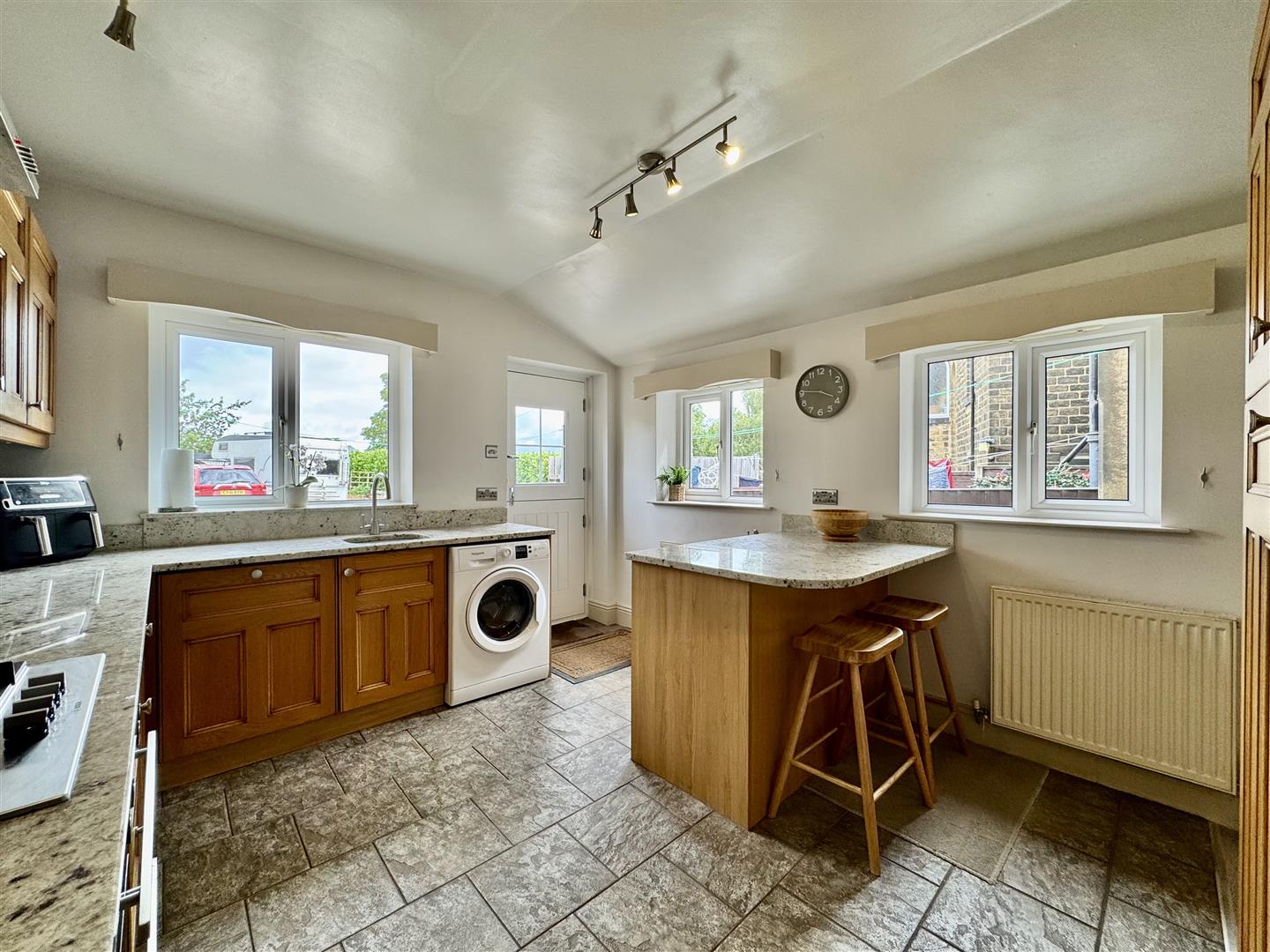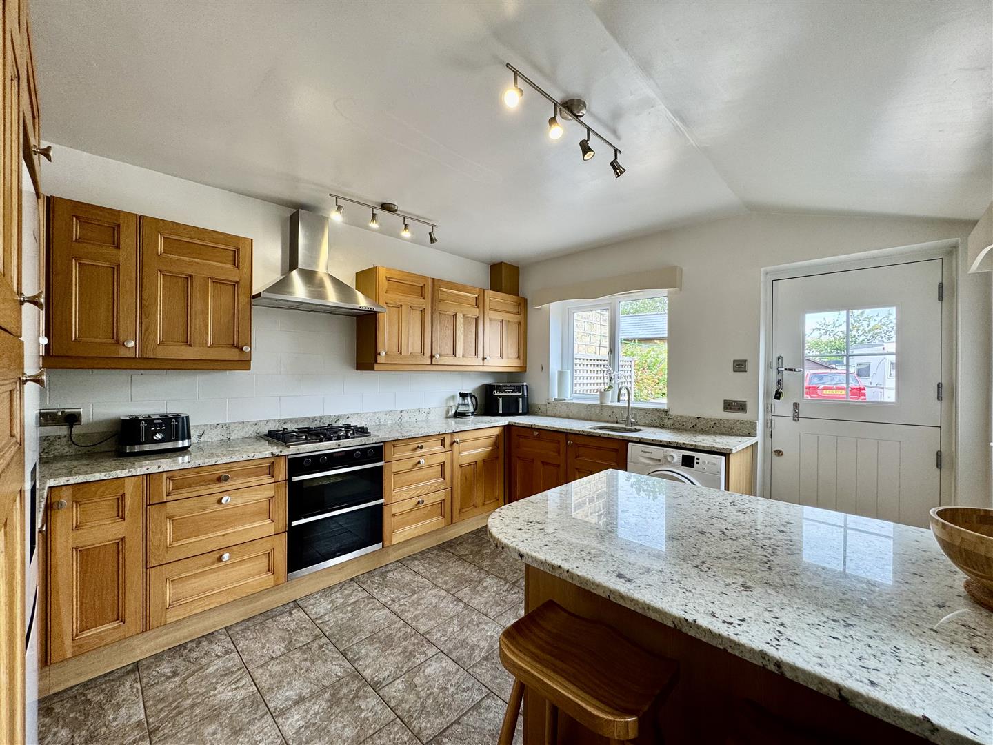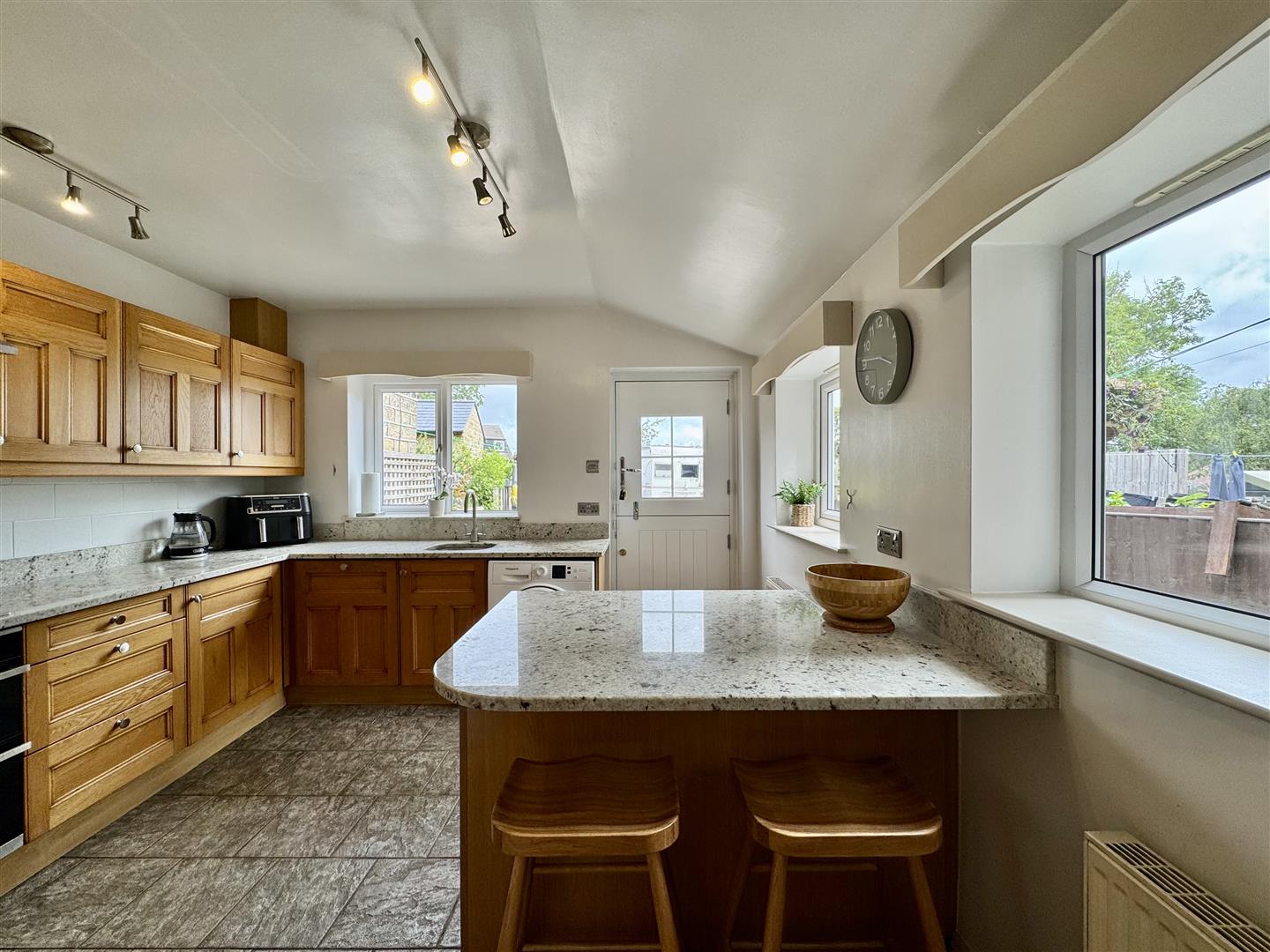This dual aspect kitchen is flooded with light and fitted with a range of timber wall and base units, complimentary granite work surfaces with matching upstands and an inset stainless steel sink with mixer tap over. Integrated appliances include a double electric oven and four ring gas hob with extractor fan over, dishwasher and plumbing for a washing machine and space for a fridge freezer. To the side of the kitchen is a breakfast bar ideal for informal dining and providing further storage. Tile flooring completes the room, an external door opens to the patio and an opening leads back through to the dining room.