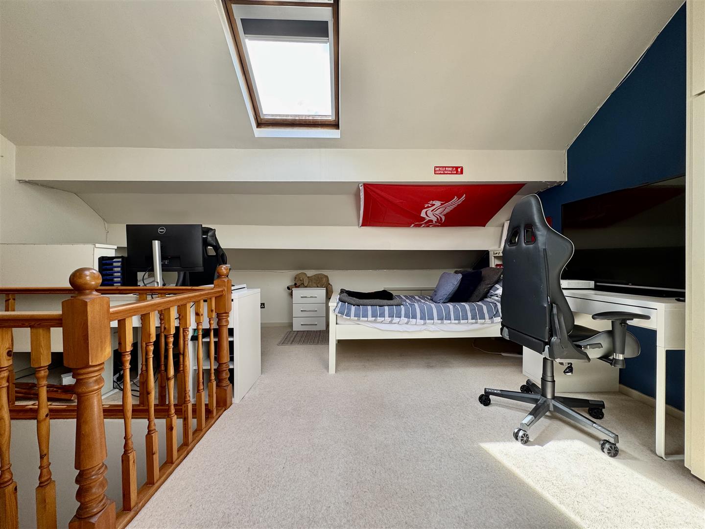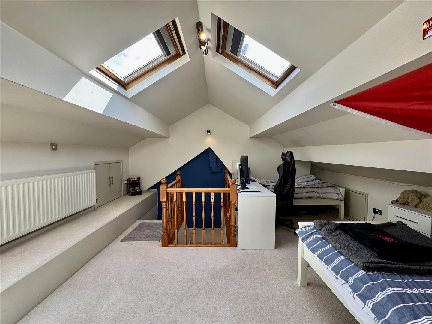 Flooded with natural light through the three velux windows, this fantastic attic bedroom has a bank of fitted wardrobes and under eaves storage. There is space for freestanding furniture and a quarter landing staircase descends to the first floor landing.