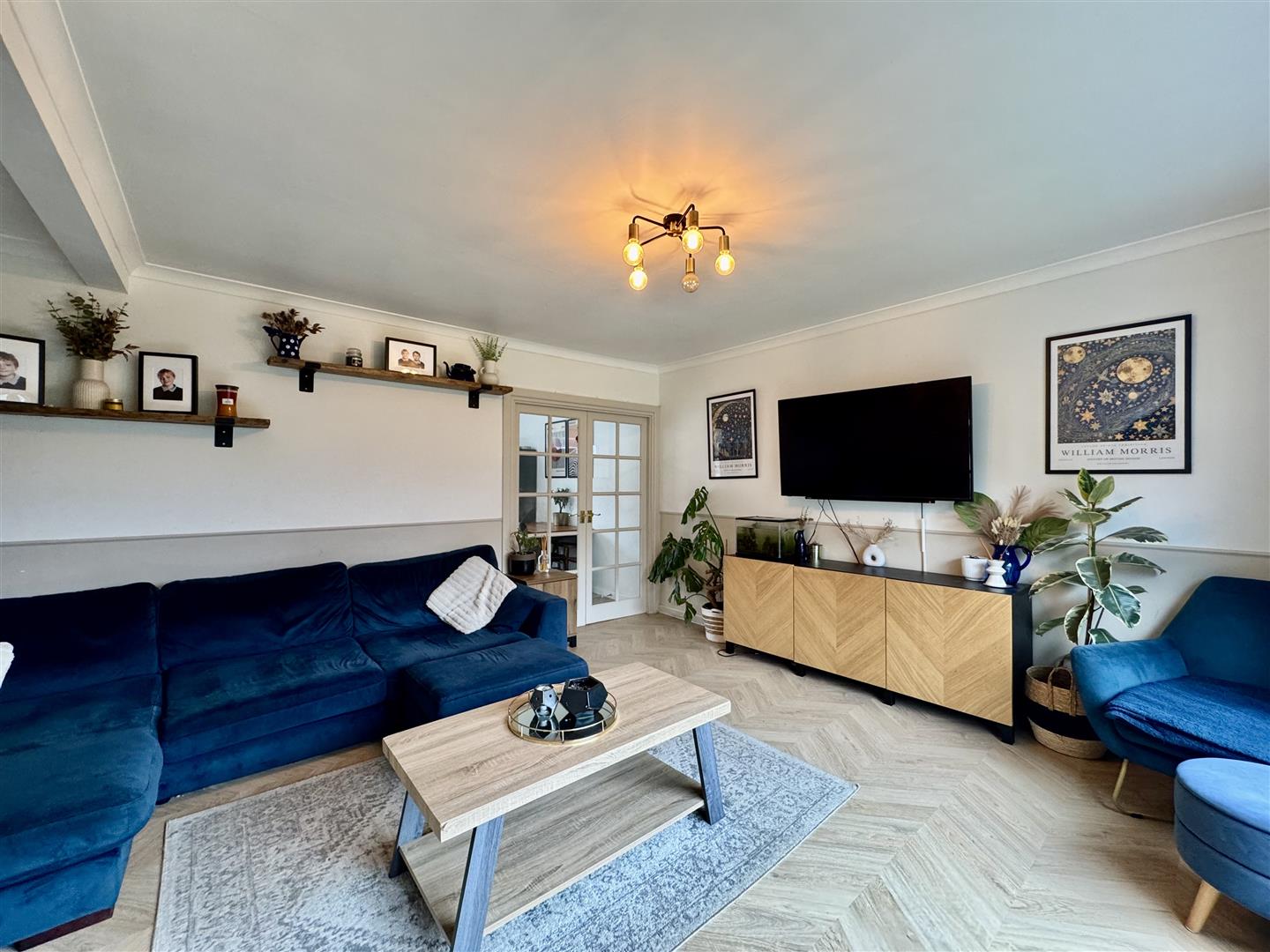 This tastefully decorated reception room has a large window allowing an abundance of natural light to flood through and plenty of space for freestanding furniture. Herringbone effect laminate flooring flows underfoot, Double doors open through to the dining kitchen and an arch leads to the entrance hall.