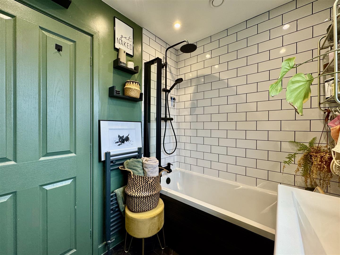 This boutique style bathroom comprises of a white three piece suite including a bath with black waterfall shower over and a bifold glass screen, vanity hand basin with mixer tap and a low flush W.C. The room is partially tiled, has an anthracite towel radiator and attractive vinyl flooring underfoot. There is an obscure glazed window and a door leads to the landing.