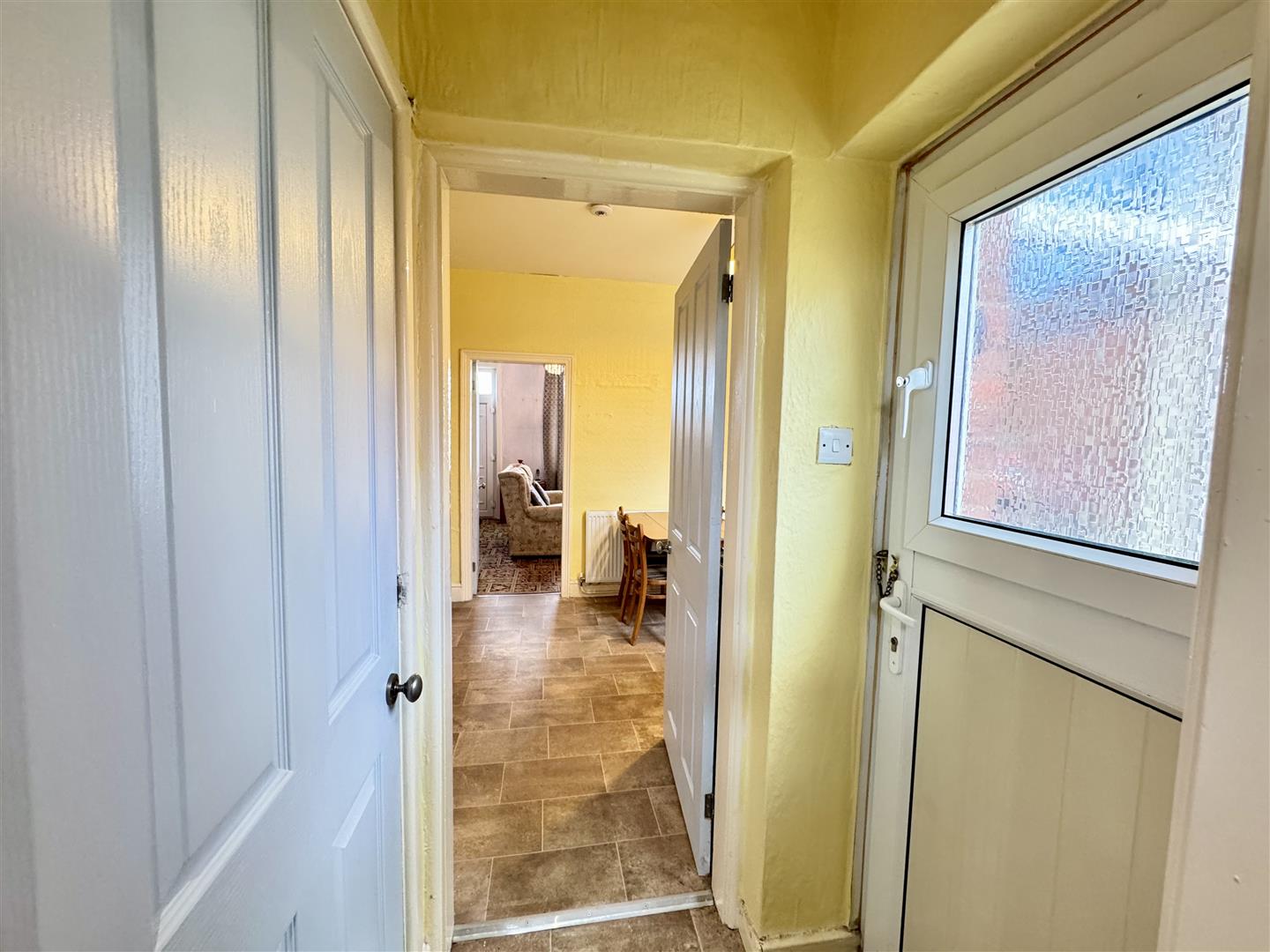 Situated between the kitchen and the ground floor shower room, separating the two spaces, there is vinyl flooring, convenient store cupboard and a uPVC stable style door leading to the rear patio garden. An internal door leads to the shower room.