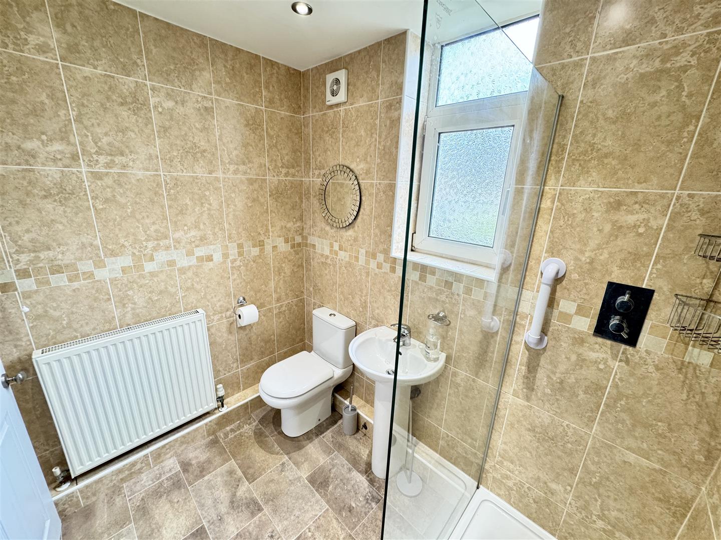 Situated at the rear of the property and having a modern three piece suite consisting of a an enclosed double shower enclosure with thermostatic rain shower, pedestal wash basin with mixer tap and twin flush low level WC. There is vinyl flooring, inset ceiling spotlighting, a wall mounted radiator, extractor fan and the walls are tiled to full height. A double glazed window with obscure glass brings in natural light and an internal door leads to the rear lobby.