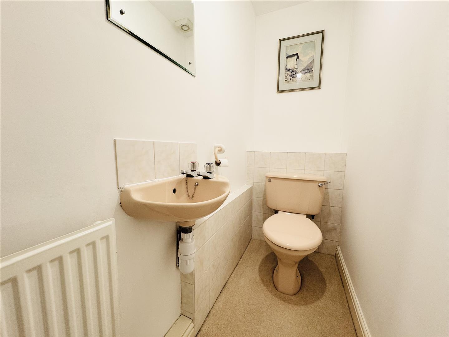 This downstairs WC is fitted with a peach wall mounted handwash basin with chrome taps and matching low level WC. There is carpet underfoot and the walls are partially tiled. A door leads to the hallway.