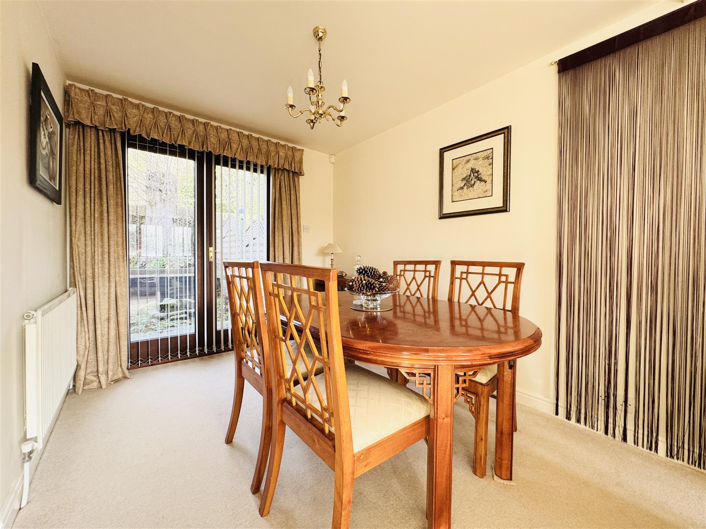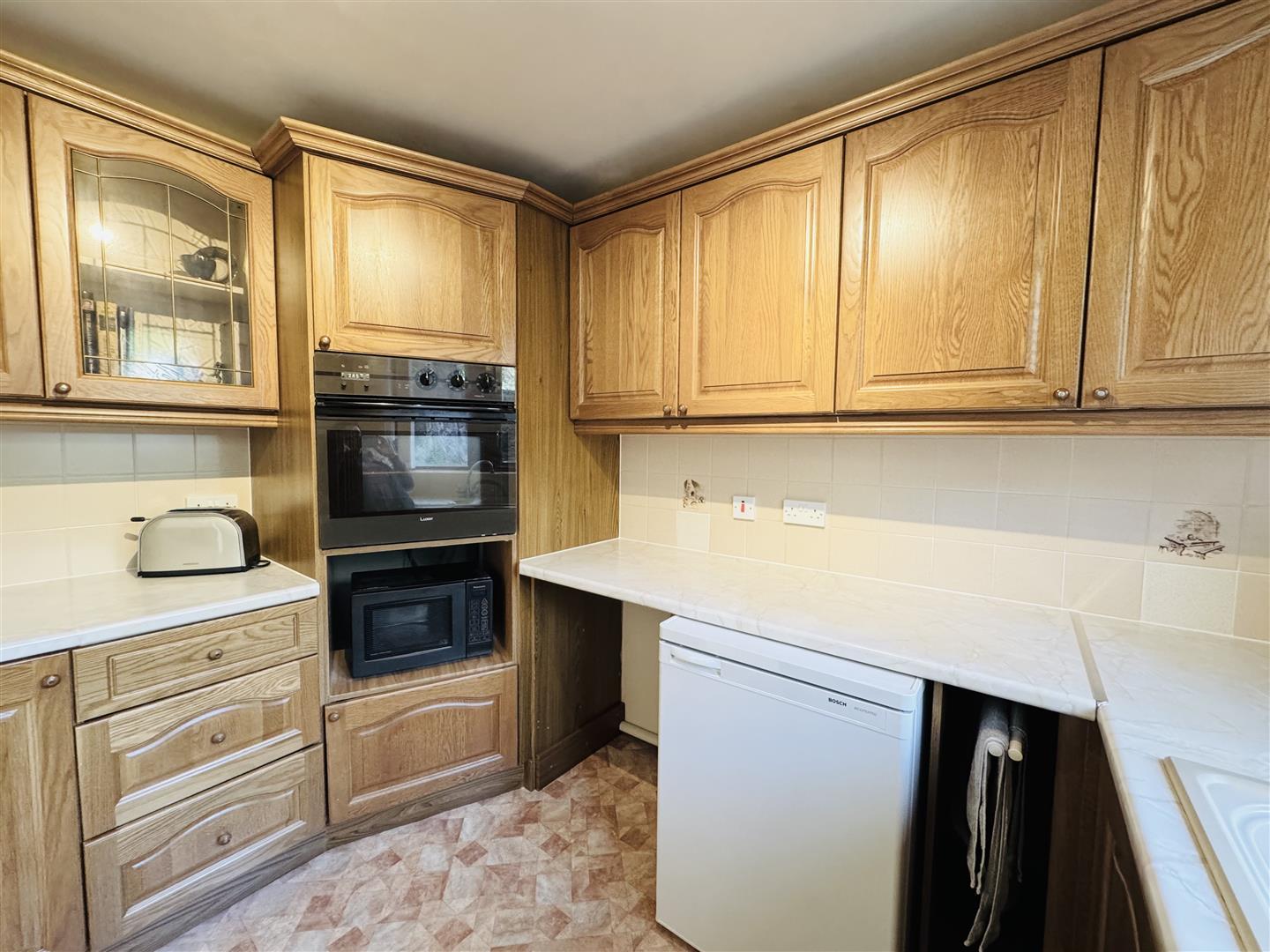 Located to the rear of the property with a window looking out to the garden, this country style kitchen is fitted with timber base and wall units, marble effect roll top worktops, tiled splashbacks and a one and a half bowl sink and drainer with mixer tap. Cooking facilities comprise of a gas four burner hob with a concealed extractor fan over and a single electric fan oven. There are spaces for two under counter appliances and space for a microwave. Vinyl flooring runs underfoot and there are spotlights to the ceiling. An opening leads through to the dining area and lounge.