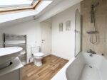 Once again nestled in the roof space, this cleverly designed bathroom is fitted with a three-piece white suite comprising a bath with mixer tap and thermostatic shower over with a protective glass screen, a pedestal hand wash basin with mixer tap and a matching low-level WC. The walls are partially tiled with beige tiles around the bathing area and behind the wash basin. Wood effect vinyl flooring runs under foot and there are spotlights to the ceiling. A chrome heated towel radiator completes the room. A Velux window allows natural light to enter and a door leads to the landing.