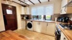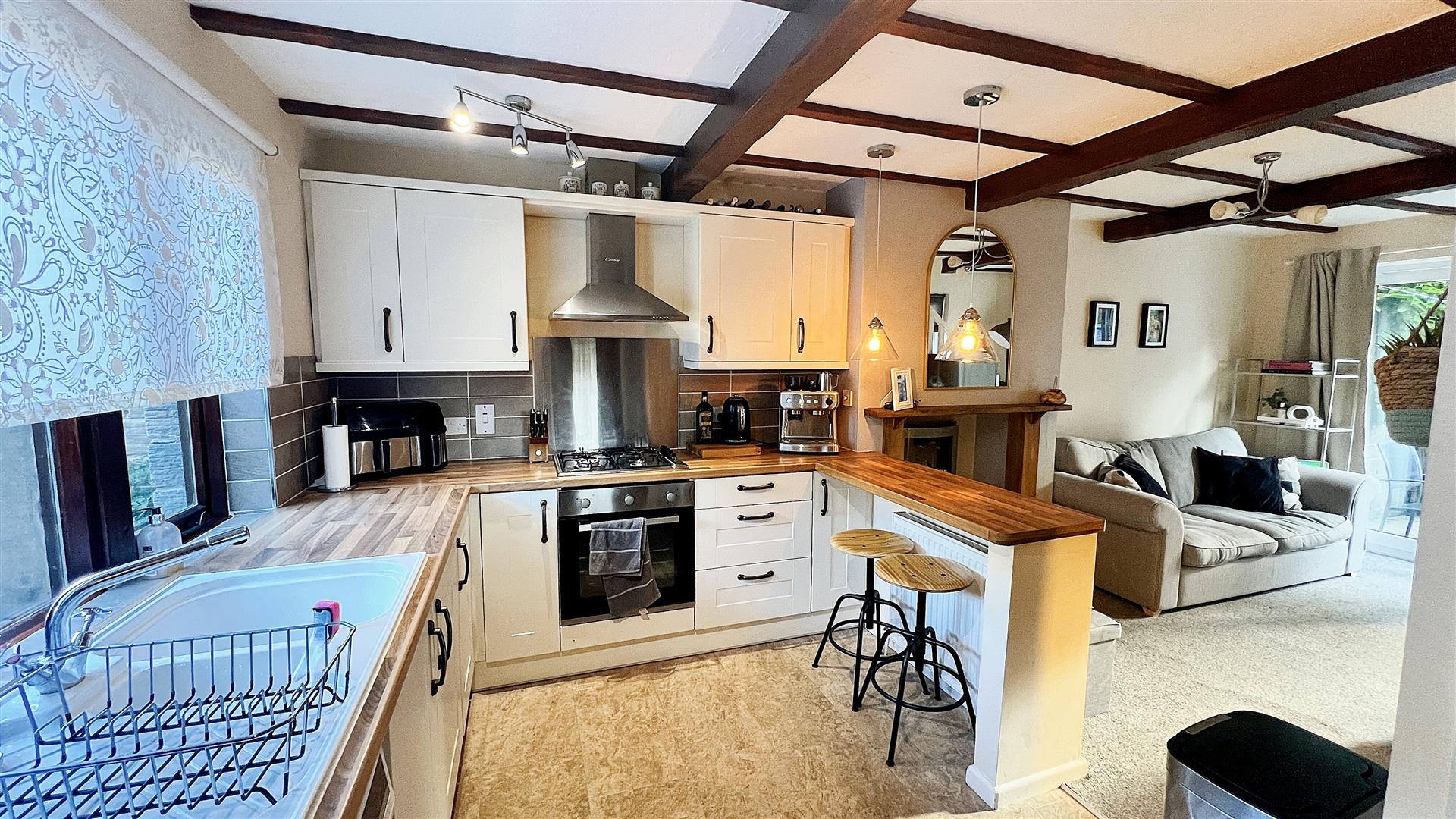 Split into two dedicated areas, the great open plan space spans the depth of the property and is flooded with an abundance of natural light having windows on 3 sides. To the front of the property is the modern kitchen which includes shaker style cream wall and base unts, with a wood block effect rolltop work surface, an inset one and a half bowl composite sink and a tiled splashback. appliances include an electric oven, gas hob with extractor hood over and there is space and plumbing for a washing machine and space for an undercounter fridge. The space has a handy breakfast bar, exposed timber beams, vinyl flooring and adjustable spotlights.