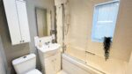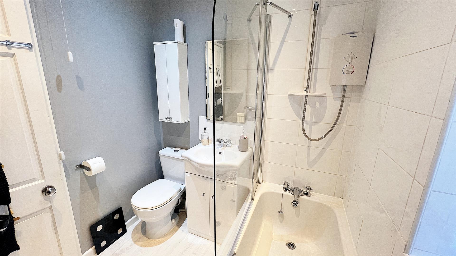 This modern house bathroom features a white three piece suite consisting of a panelled bath with chrome mixer tap and electric shower over, a handwash basin set in a vanity unit and a low flush W.C. There is an additional storage cupboard, a wall mounted mirror, vinyl flooring and a front facing obscure glazed window.