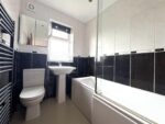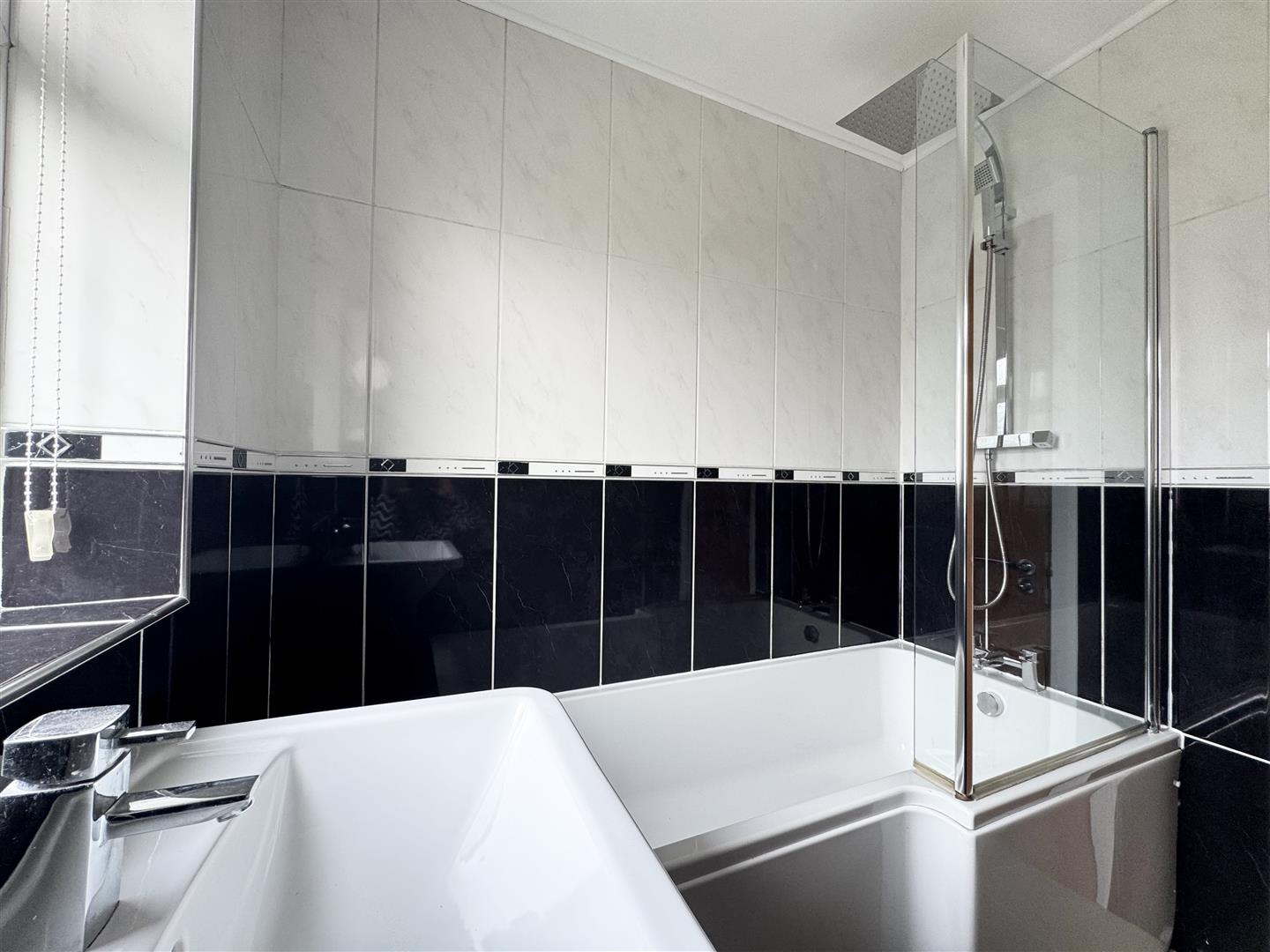 This lovely family bathroom is fully tiled with monochrome tiles and fitted with a white three piece suite, including a bath with chrome mixer tap and waterfall thermostatic shower over, pedestal hand wash basin with mixer tap and a low flush W.C. The room has a black ladder style heated towel rail, spot lighting to the ceiling and a mirror cabinet offering some storage. An obscure window allows natural light to enter and a door leads to the landing.