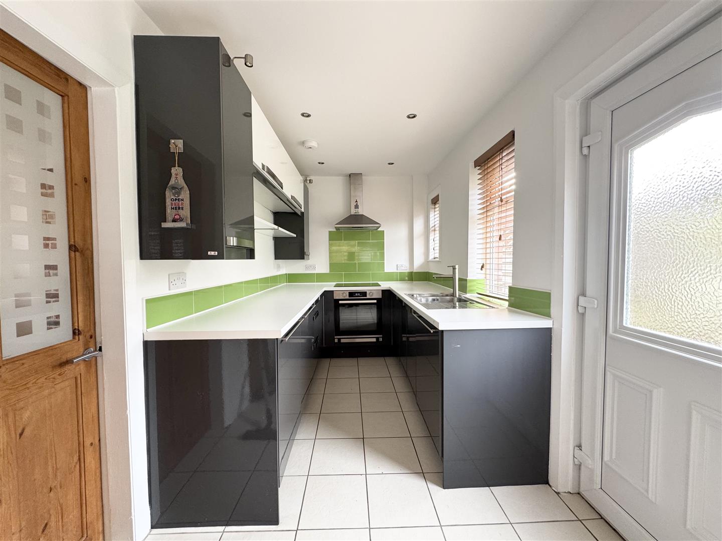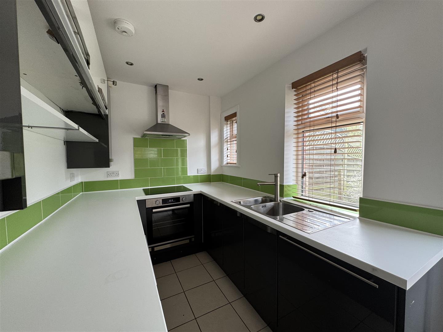 Spanning the rear of the property and light and airy from windows to dual aspects, this modern dining kitchen is fitted with dark grey high gloss wall and base units, contrasting white laminate work surfaces with striking lime green tiled splashbacks and a one and a half bowl stainless steel sink and drainer with mixer tap over. Integrated appliances include an induction hob with a stainless steel extractor fan over and a single electric oven. Integrated appliances include a dishwasher and both an undercounter fridge and freezer. A large understairs cupboard to one corner houses the property's central heating boiler and has space and plumbing for a washing machine. The dining area has room to accommodate a table and chairs. Ceramic tiles run underfoot and there are spotlights to the ceiling. A part glazed uPVC door gives access to the rear garden and a door leads to the lounge.