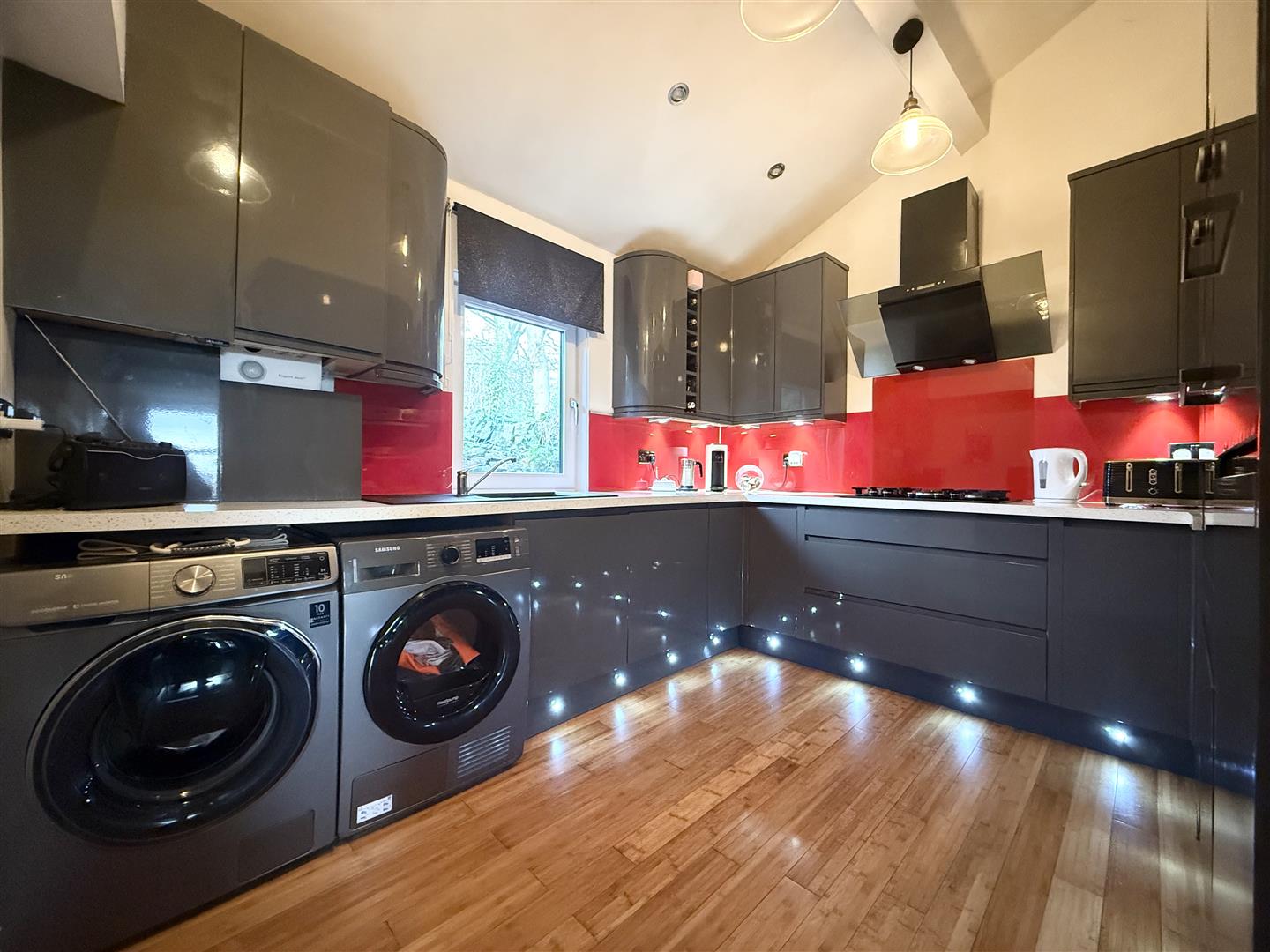 This modern kitchen is fitted with grey close wall and base units including a wine rack, contrasting granite effect laminate work surfaces, black sink and drainer with mixer tap and coloured splashbacks. There is an integrated fridge freezer, double oven and grill, five ring gas hob and extractor over, alongside space for a washing machine and tumble dryer. A high angled ceiling houses spot lighting, there is a rear facing window, the property’s central heating boiler is neatly tucked away in a wall cupboard, there are plinth lights and wood effect flooring. A door leads to the lounge.