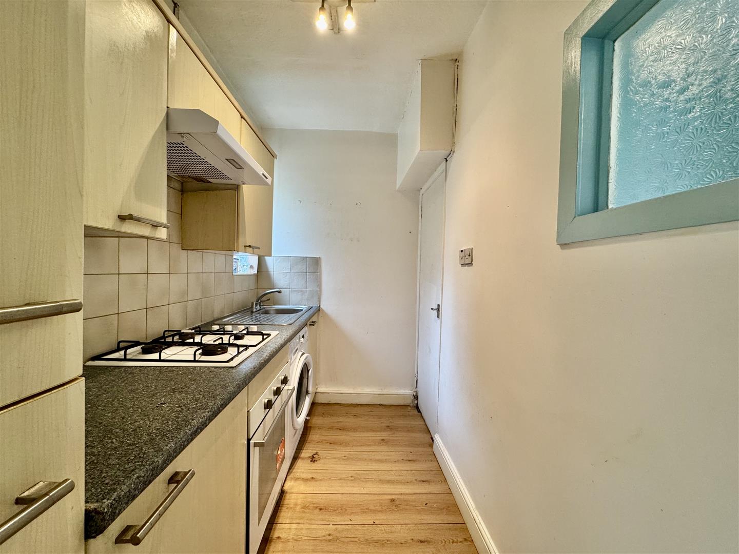 This charming kitchen is fitted with a range of wood effect wall and base units, roll top work surfaces, cream tiled splash backs and a sink and drainer with mixer tap over. Integrated appliances include an electric oven, four ring gas hob, washing machine and fridge freezer. A rear facing window overlooks the garden, there is a ceiling light fitting and laminate flooring. A door leads to the cellar.