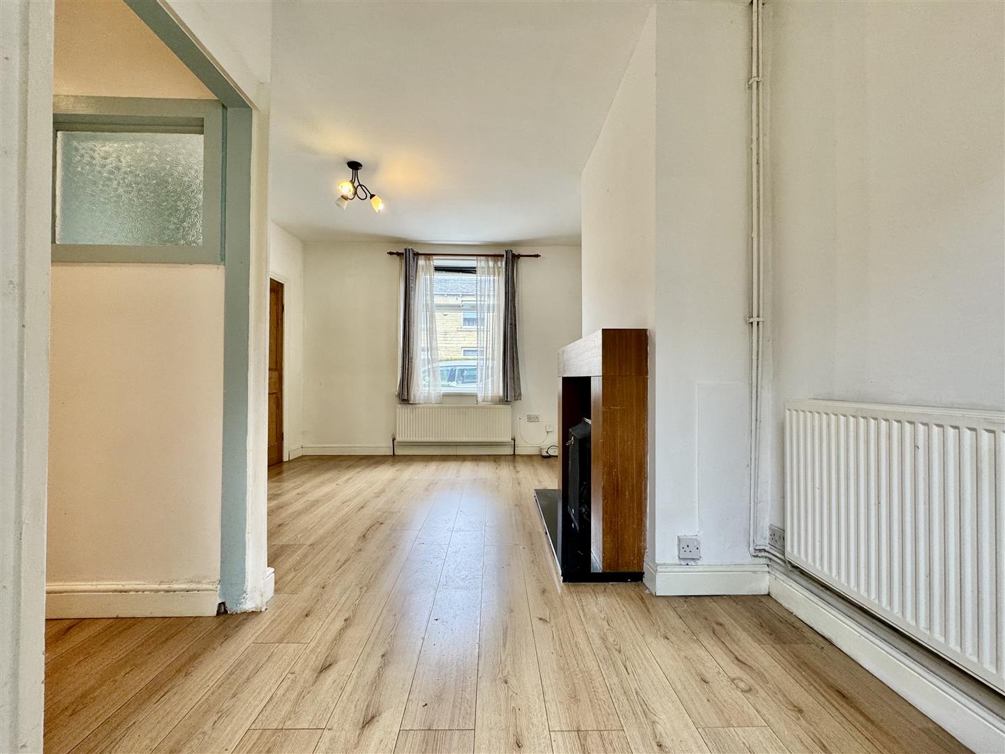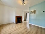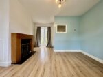 Bursting with natural light, this excellent living room has a large front facing window and ample space to store freestanding furniture. A gas fire with modern timber surround and marble hearth create a nice focal point and laminate flooring completes the room. A door leads to the entrance hall, a doorway opens to the kitchen, and patio doors open onto the rear garden.