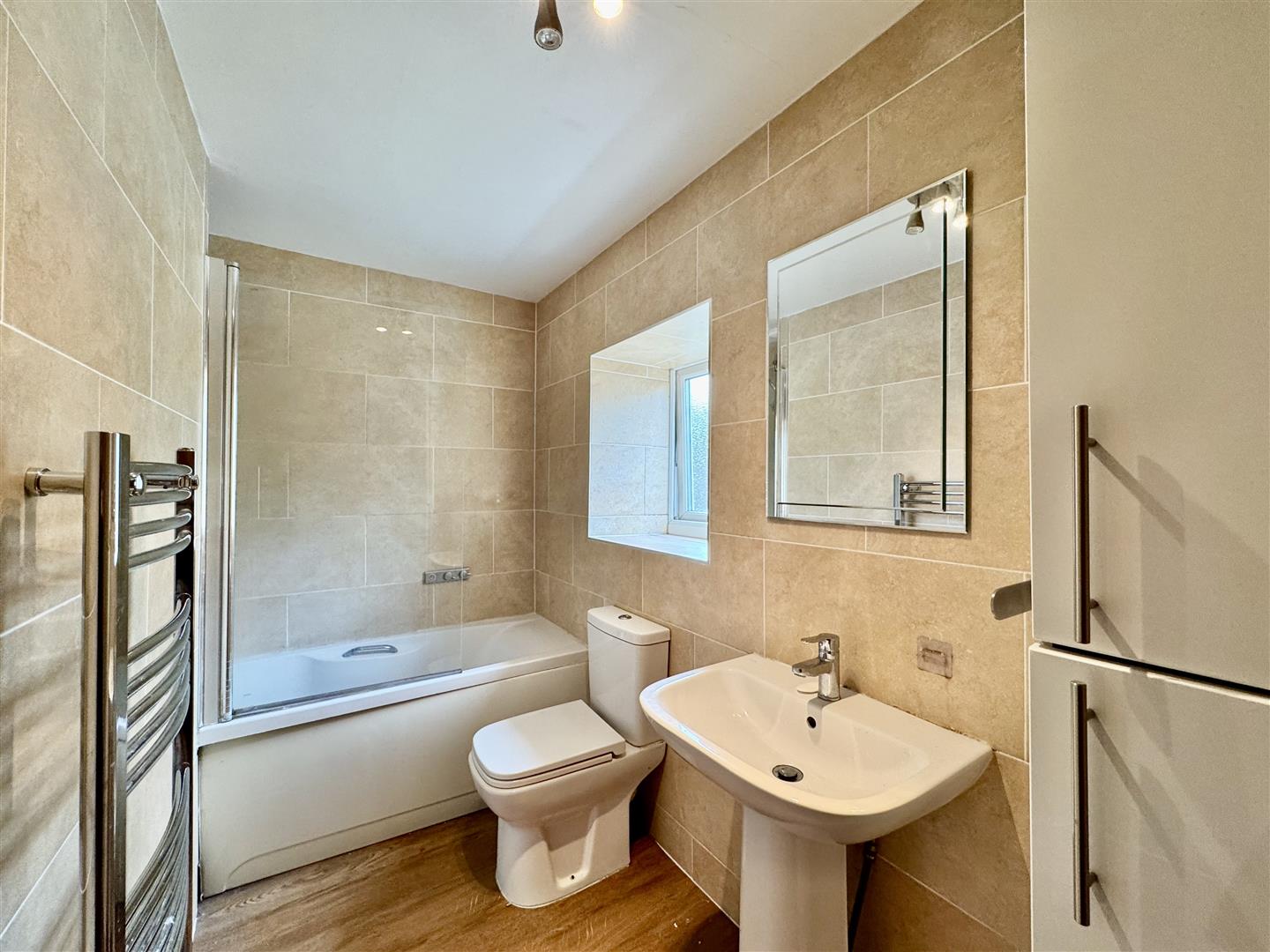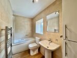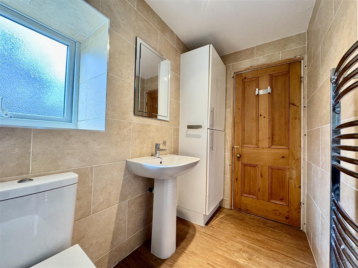 This modern house bathroom is fitted with a three piece white suite including a bath with shower over, low level W.C and pedestal hand wash basin. The room is fully tiled with attractive wall tiles, there is a cupboard to one corner which neatly houses the property's combi boiler and a rear obscure glazed window floods the room with light. Laminate flooring and a ceiling light complete the space and there is also a chrome heated towel rail.