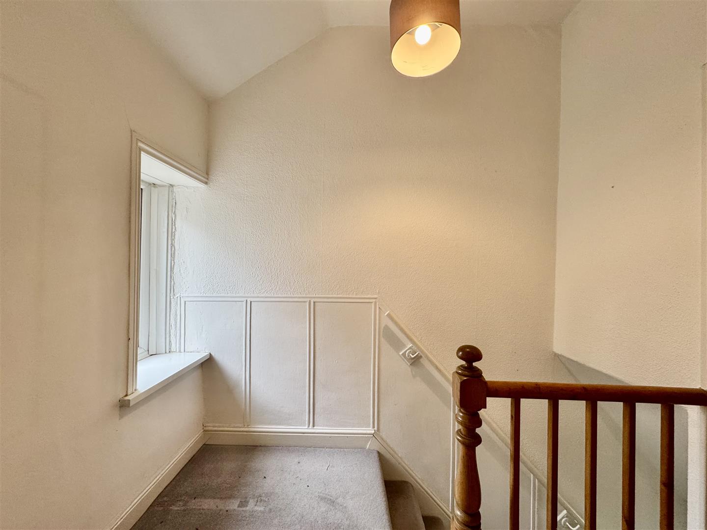 Stairs ascend from the entrance hall to the first floor landing which has a rear facing window and a loft hatch providing access into the loft space. There is a ceiling light, carpeted flooring and doors lead to the two bedrooms and house bathroom.