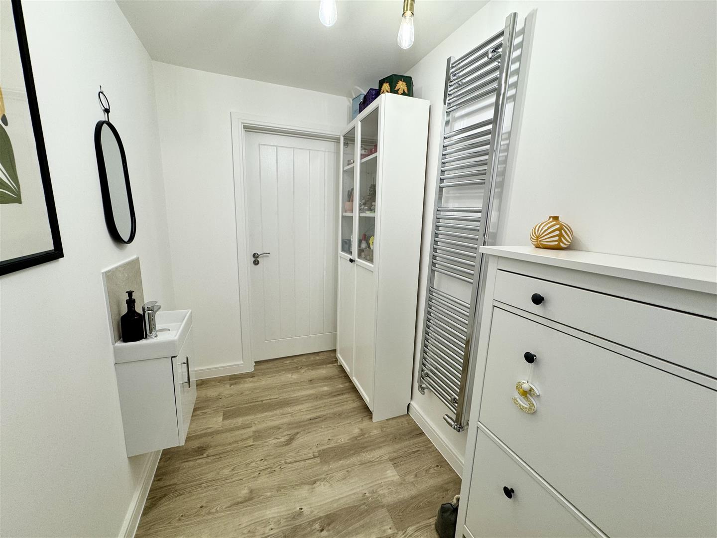 A very generous ground floor cloakroom WC, which in other properties has been converted into a utility room. There is a two piece suite in white consisting of a close coupled WC and a wall mounted vanity wash basin with mixer tap and storage under. There is LVT flooring, tiling to the walls, a ceiling light, a wall mounted radiator and a double glazed window with obscure glass brings in natural light. An internal door leads to the inner hall.