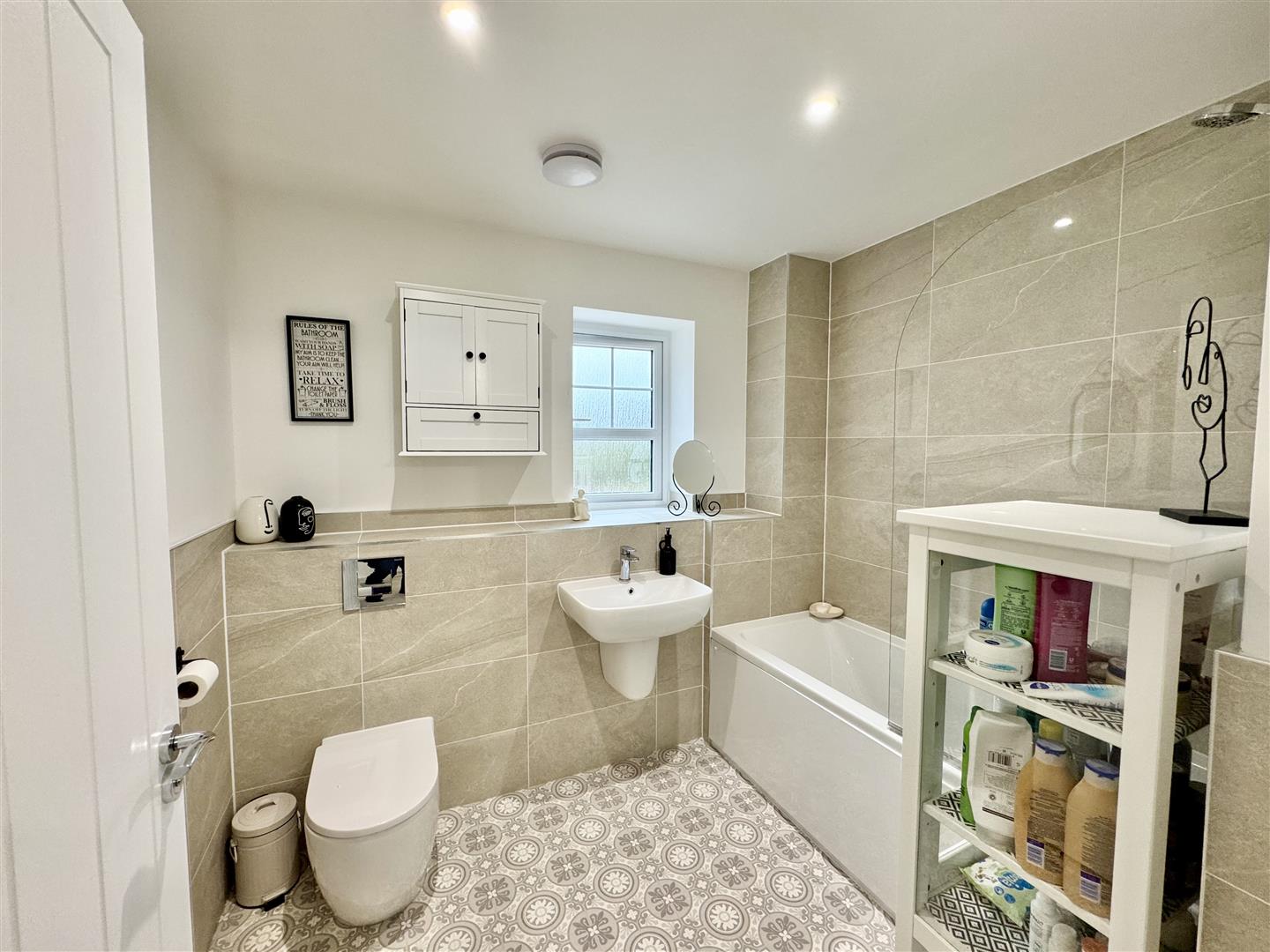 Stylish, well equipped bathroom having a three piece suite in white consisting of a panel bath with mixer tap, thermostatic shower over and glass screen, wall mounted wash basin with mixer tap and close coupled WC. There is tiling on the walls to dado height plus in the shower, vinyl flooring runs underfoot, there is a chrome ladder towel radiator and inset ceiling spotlights. A double glazed window with obscure glass brings in natural light, there is an extractor fan and an internal door leads to the landing.