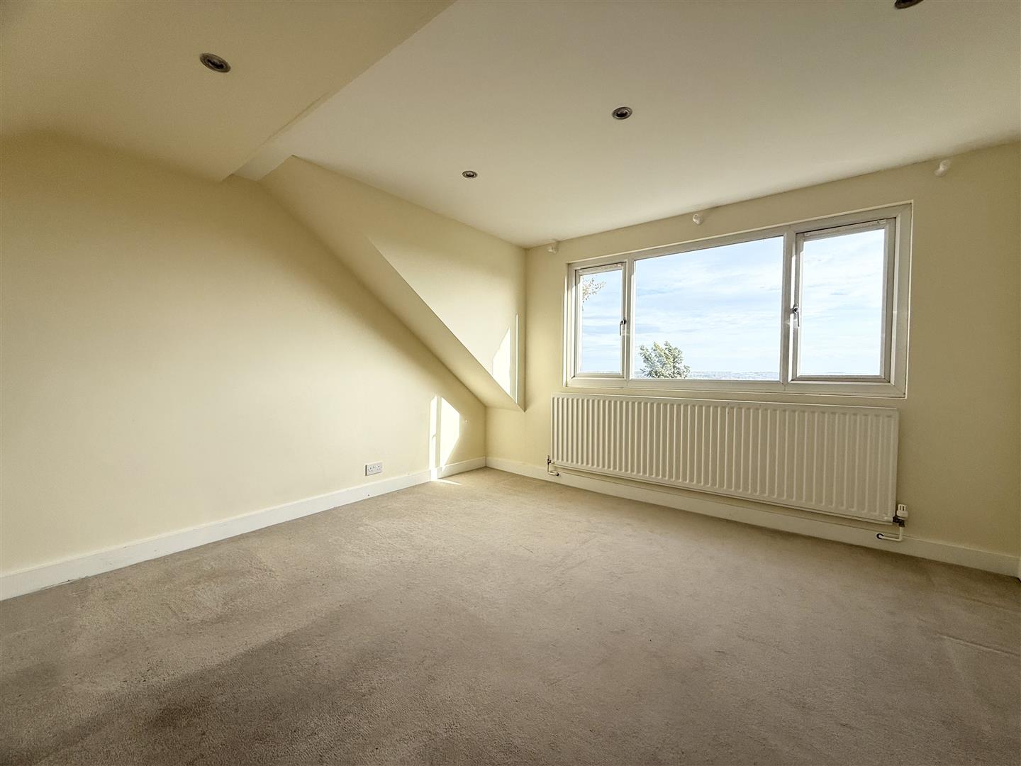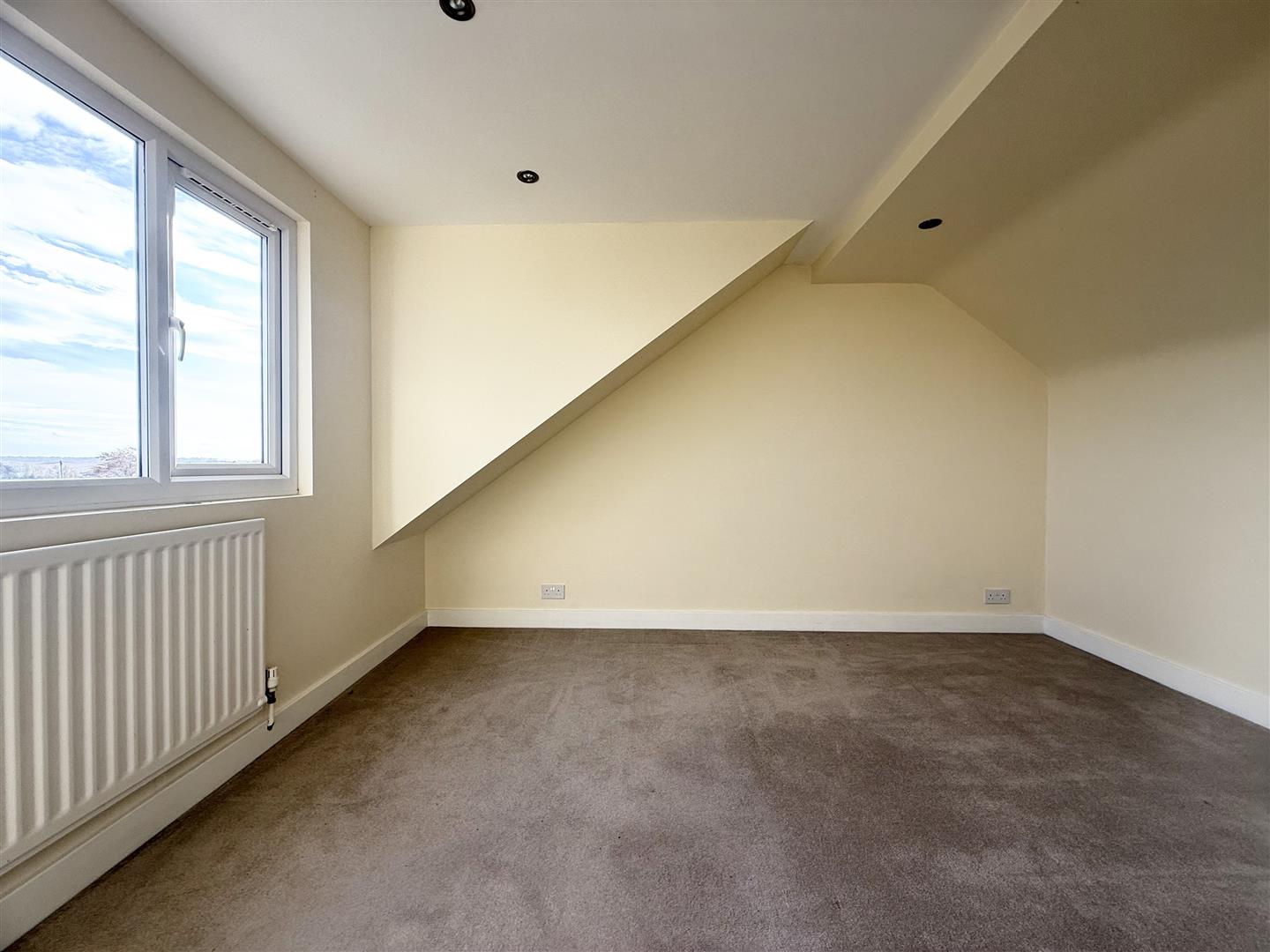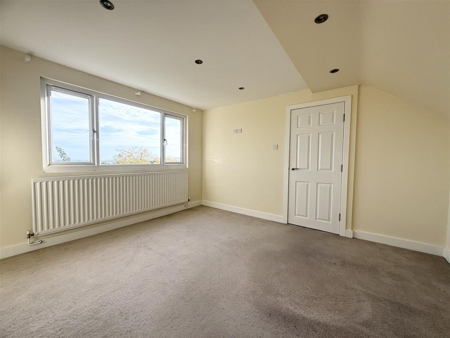 This light and airy double bedroom can comfortably house a range of bedroom furniture and is decorated in neutral tones. There are spotlights on the ceiling, a rear-facing window that enjoys far-reaching views, carpeted flooring, and a door leading to the landing.