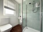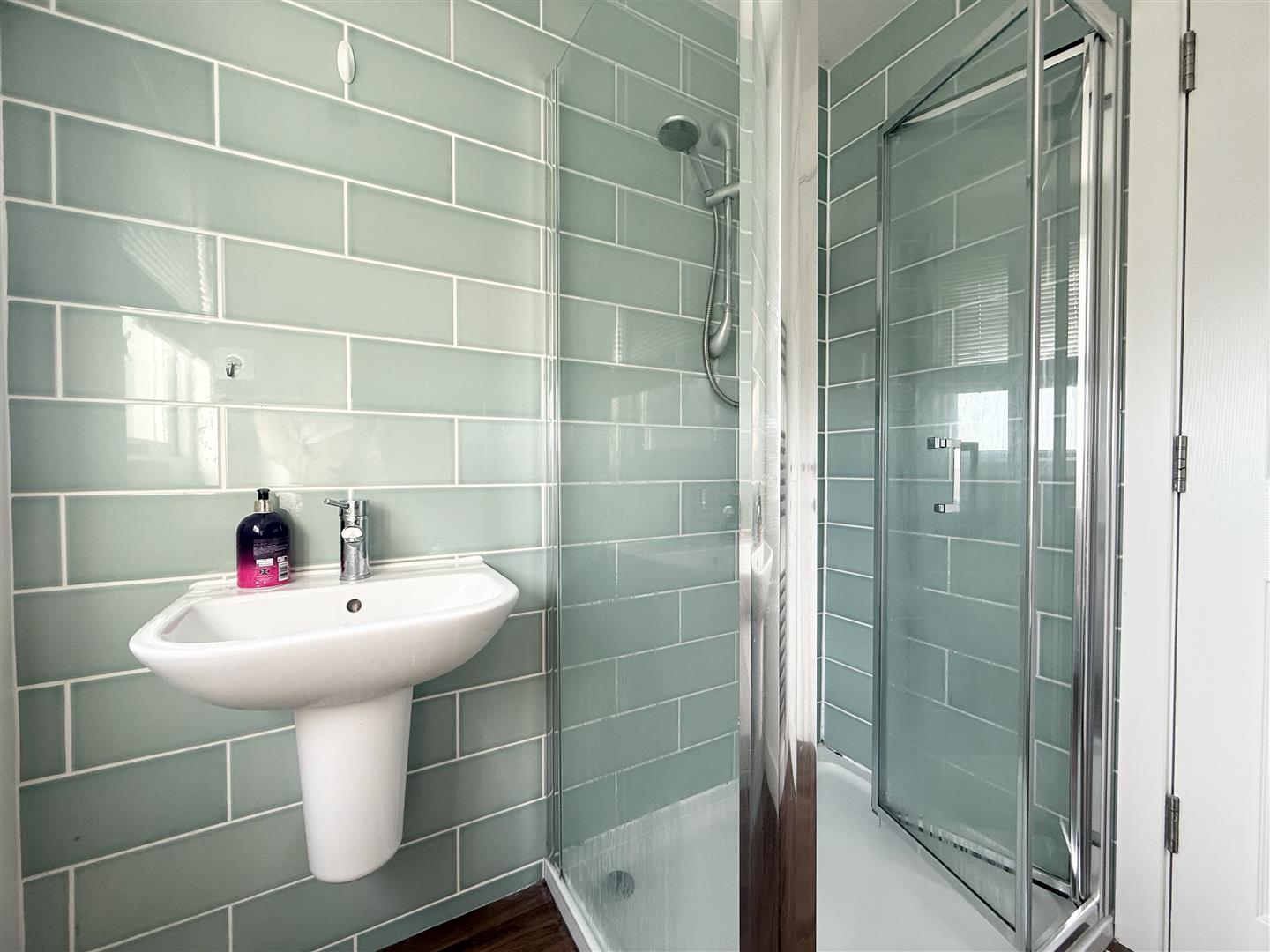 This contemporary shower room is fitted with a shower cubicle with an electric shower, a wall-mounted hand wash basin with mixer tap, and a low-level W.C. The room is partially tiled with decorative wall tiles, has an obscure-glazed rear-facing window, spot lighting, wood-effect vinyl flooring, and a chrome heated towel rail. A door leads to the first-floor landing.