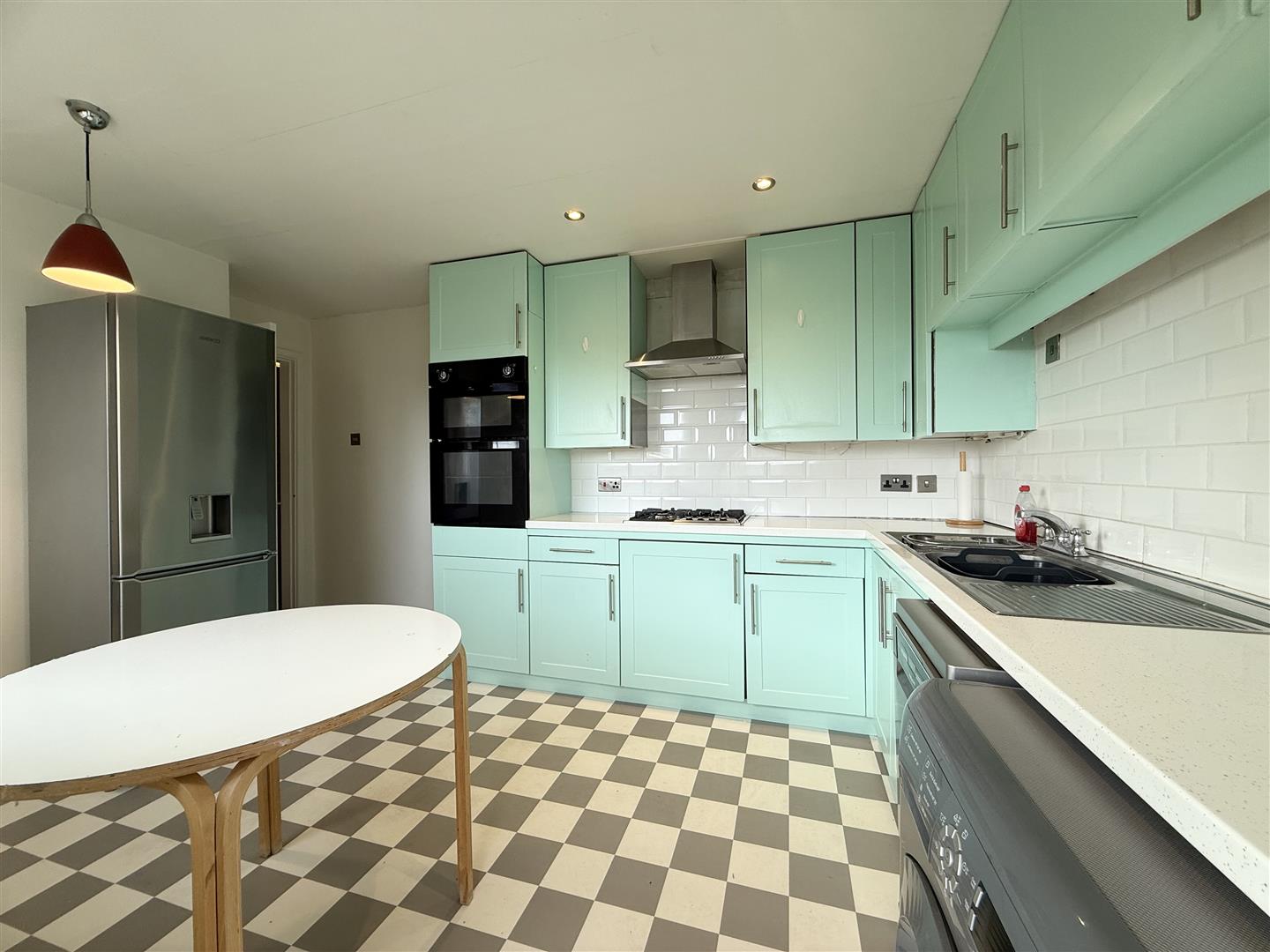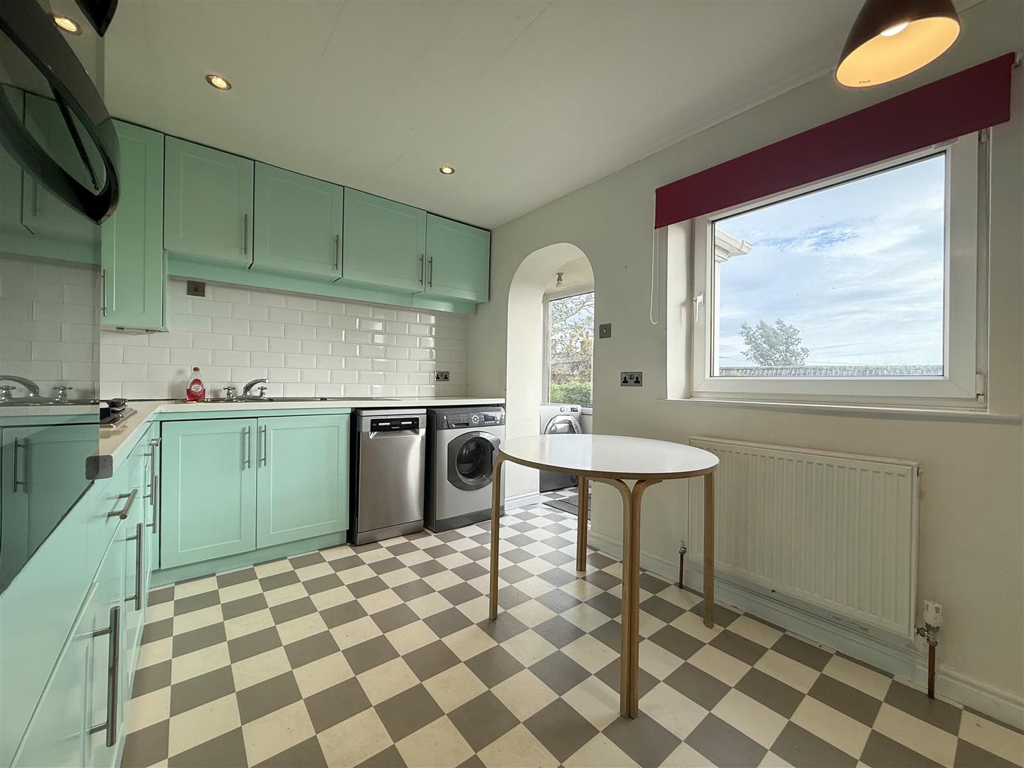 Fitted with painted wall and base units, white work surfaces, tiled splashbacks, and a one-and-a-half-bowl stainless steel sink with drainer and mixer tap, the kitchen also includes a double oven, four-ring gas hob, extractor fan, and space for other freestanding appliances such as a fridge freezer, washing machine, and slimline dishwasher. The room offers space for a breakfast table and chairs if desired, and features a rear-facing window, spot lighting, and vinyl flooring. An opening leads to the rear porch, and a door provides access to the entrance hall.
