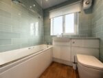 Comprising a modern three-piece white suite including a bath with mixer tap and electric shower over, hand wash basin with mixer tap set upon a vanity unit, and a concealed-unit W.C., this stylish bathroom is fully tiled with attractive wall tiles. It also features an obscure-glazed, rear-facing window, spot lighting to the ceiling, a chrome heated towel rail, and wood-effect vinyl flooring. A door leads to the hall.