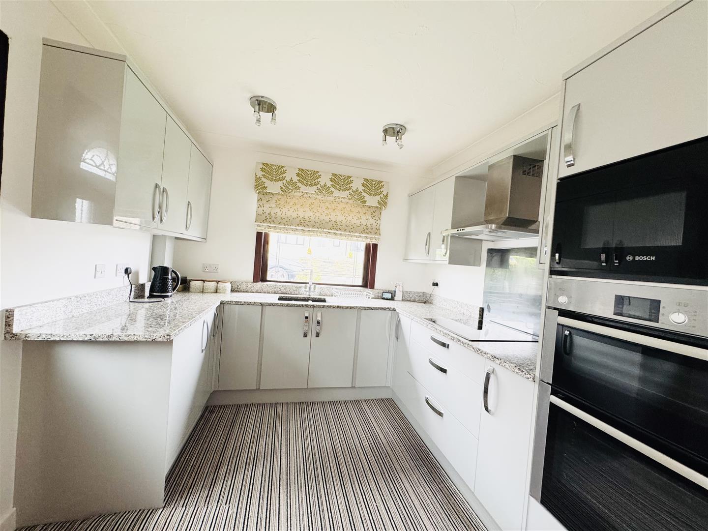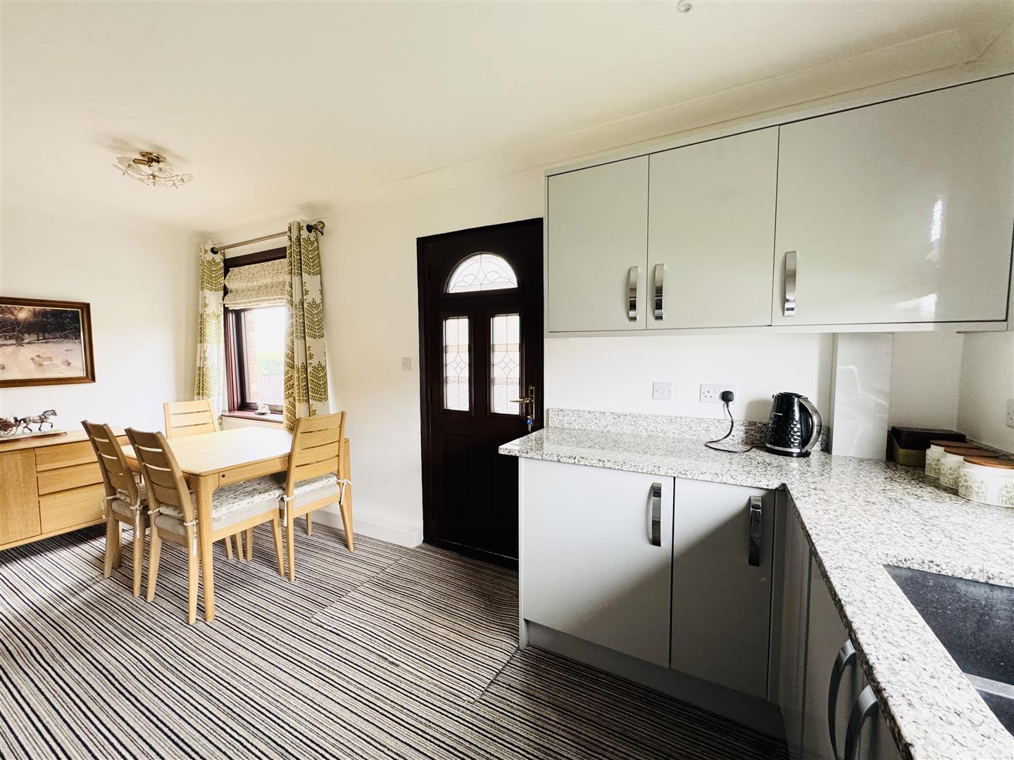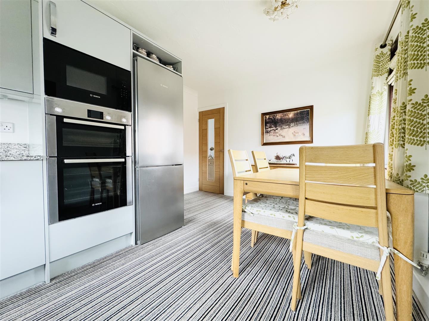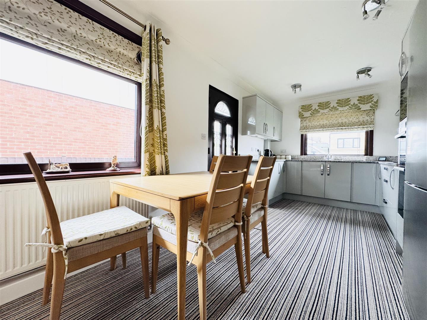 Light and airy courtesy of windows to dual aspects, this modern dining kitchen is fitted with a range of pale grey gloss base and wall units with marble work surfaces and upstands and a one and a half bowl inset sink with mixer tap. Cooking facilities comprise an integrated microwave, double oven and an electric hob with a stainless steel extractor fan over. Integrated appliances include a washing machine and a tall fridge freezer. There is ample space to accommodate a good sized dining table. A part glazed uPVC door leads out to the driveway and an oak door leads to the hallway.