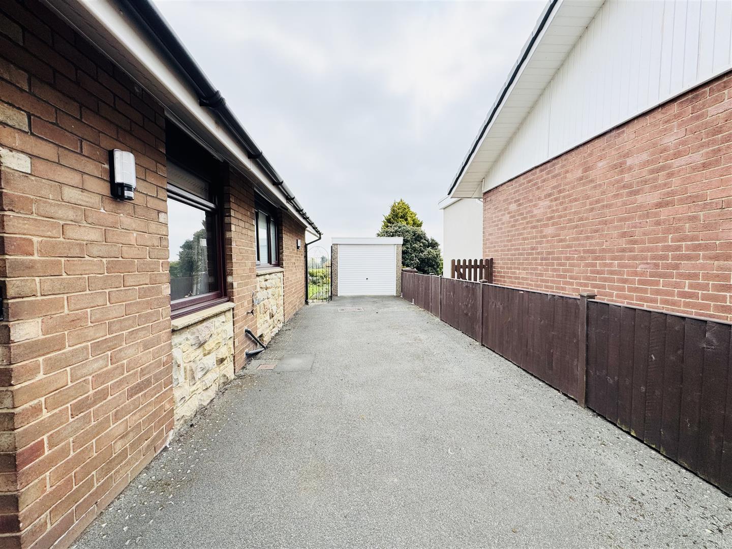 To the front of the property is a lawned garden with planted beds to the perimeter. A gated driveway leads down the side of the property providing parking for multiple vehicles and leading to a single detached garage which has an up and over door and a side facing window.