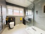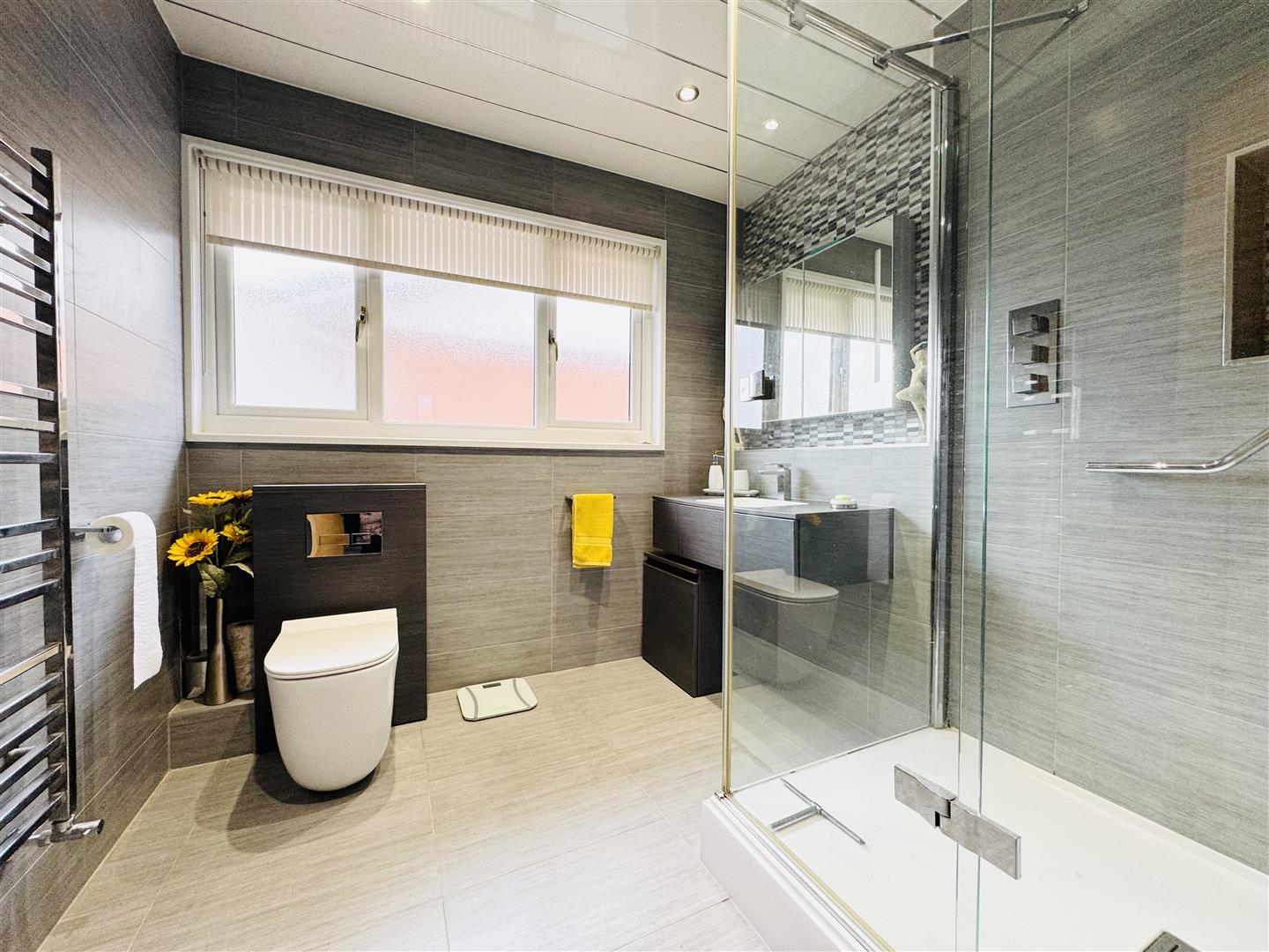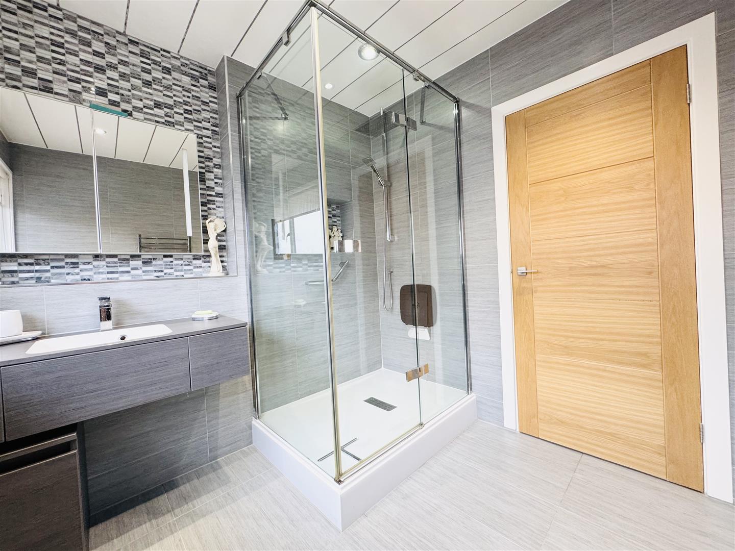 This beautifully presented contemporary shower room is fitted with grey vanity furniture incorporating a floating drawer unit with integral handwash basin, a concealed cistern WC and a step in double shower enclosure with a thermostatic mixer shower. The room is fully tiled with large grey tiles which also continue underfoot and there is an attractive mosaic tiled area behind the basin adding interest. Spotlights to the ceiling and a chrome heated towel rail completes the room. A large obscure window allows natural light to enter and an oak door leads to the hallway.