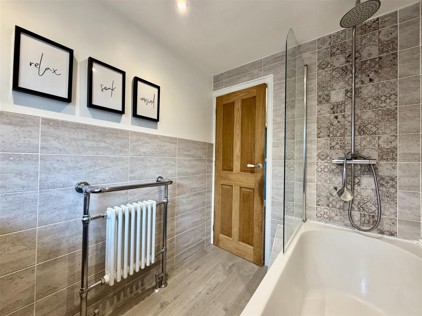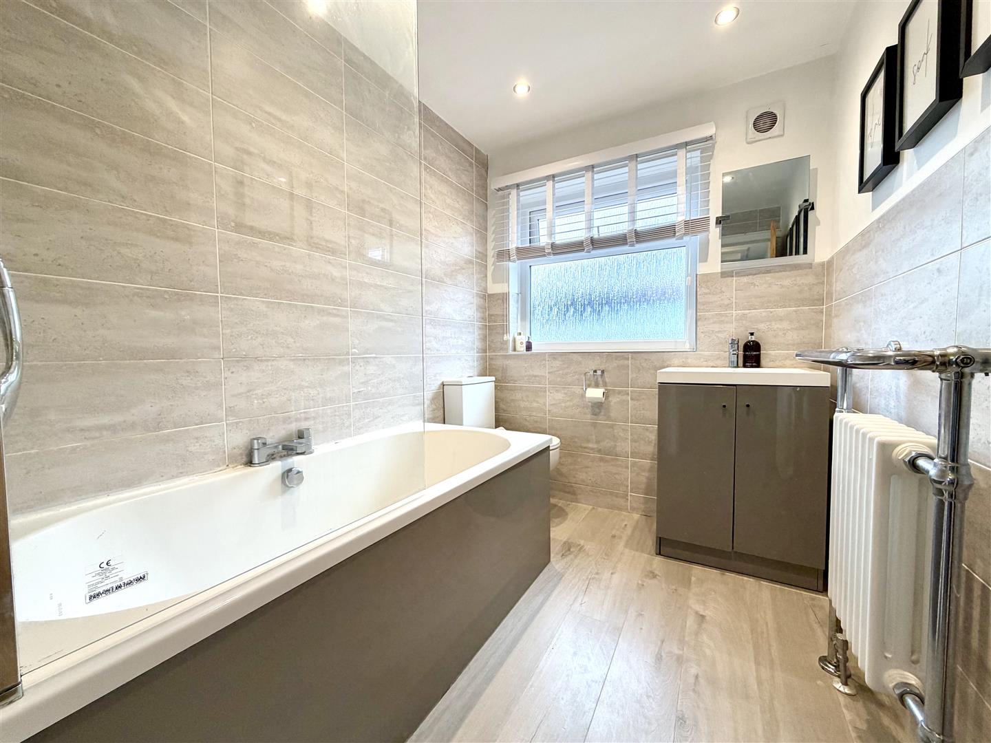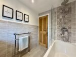 Located to the front of the property and being furnished with a modern three piece white suite with contrasting grey tiled surround comprising low flush w.c, hand wash basin with fitted vanity unit beneath, panelled bath unit with over-bath shower and fitted screen, recessed spotlighting to the ceiling, fitted period style towel rail radiator and obscured double glazed window to the rear.