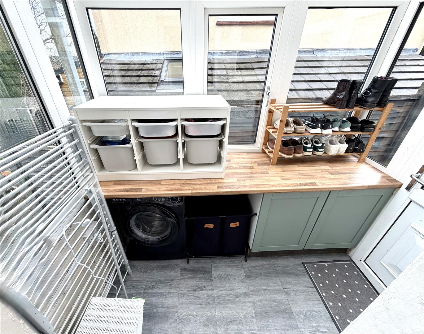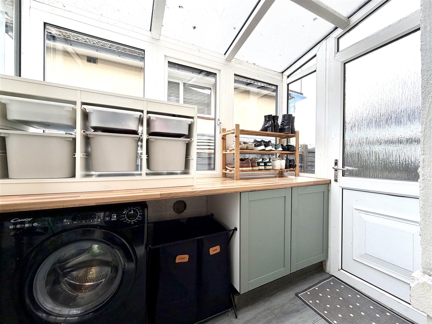 A useful addition to the accommodation positioned to the side and accessed from both the kitchen and externally, including fitted laminate flooring, useful storage, plumbing for washing machine with working space above, shoe storage space and Upvc windows and side entrance door giving access to both front and rear.