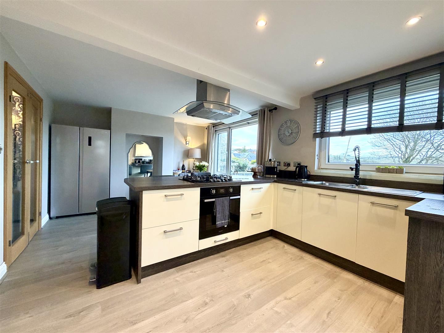 A stunning open plan dining kitchen situated to the rear of the property with elevated views over the rear garden and beyond being fitted to a high standard with a stylish range of contemporary high gloss wall, base and cupboard units with contrasting wood veneer work surfaces and useful breakfast bar, with inset one and a half bowl sink unit, integrated electric oven, gas hob and stainless steel extractor hood over, plumbing for a dishwasher and fitted laminate flooring underfoot. There is generous space for a dining table and other freestanding furniture or seating, affording an ideal entertaining space with further glazed double doors leading through to the living room and Upvc double glazed side door to Utility Porch.