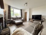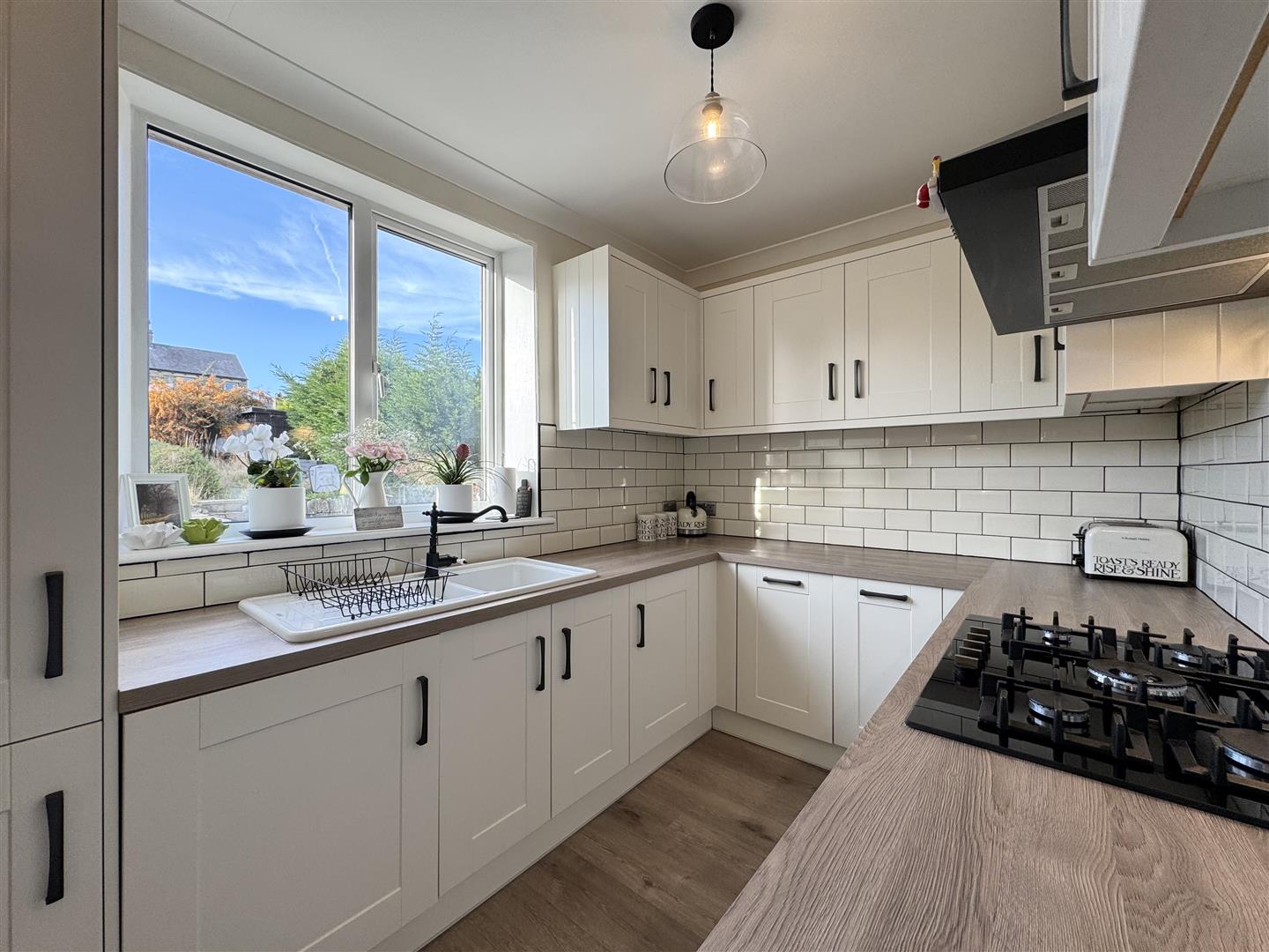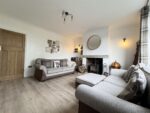 Located to the rear of the property with a large window looking out to the parking area and garden beyond, this stunning kitchen is fitted with a range of off white shaker style wall and base units, contrasting timber effect work surfaces, white metro tiled splashbacks with contrasting grout and a ceramic one and a half bowl sink and drainer with a black mixer tap. Cooking facilites comprise a black five burner gas hob with a matching extractor fan over, a single electric oven and an integrated microwave oven. Integrated appliances include an undercounter fridge, undercounter freezer, washing machine and a slimline dishwasher. A larder style cupboard to one corner utilises the under-stairs space providing storage for household items. the dining area has a high level obscure window allowing light to enter and has space for a dining table and chairs. Oak effect flooring completes the room and a timber door leads through to the lounge. An external part glazed uPVC door provides access to the rear of the property.